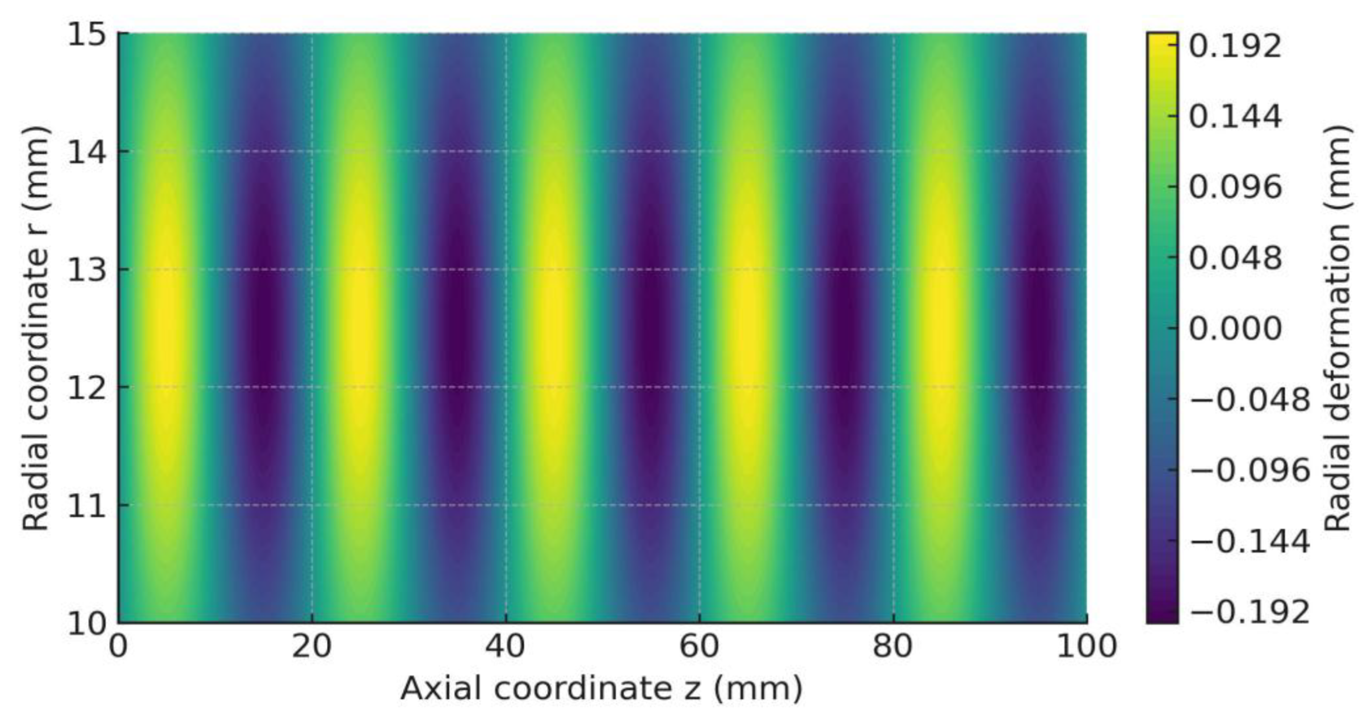 Figure 6b) manifests itself as the bulging of individual corrugations inward or outward without significant displacement of the overall axis. This mechanism is predominant for thin-walled bellows with a large number of corrugations and can occur at pressures lower than required for global buckling. The combined shape (