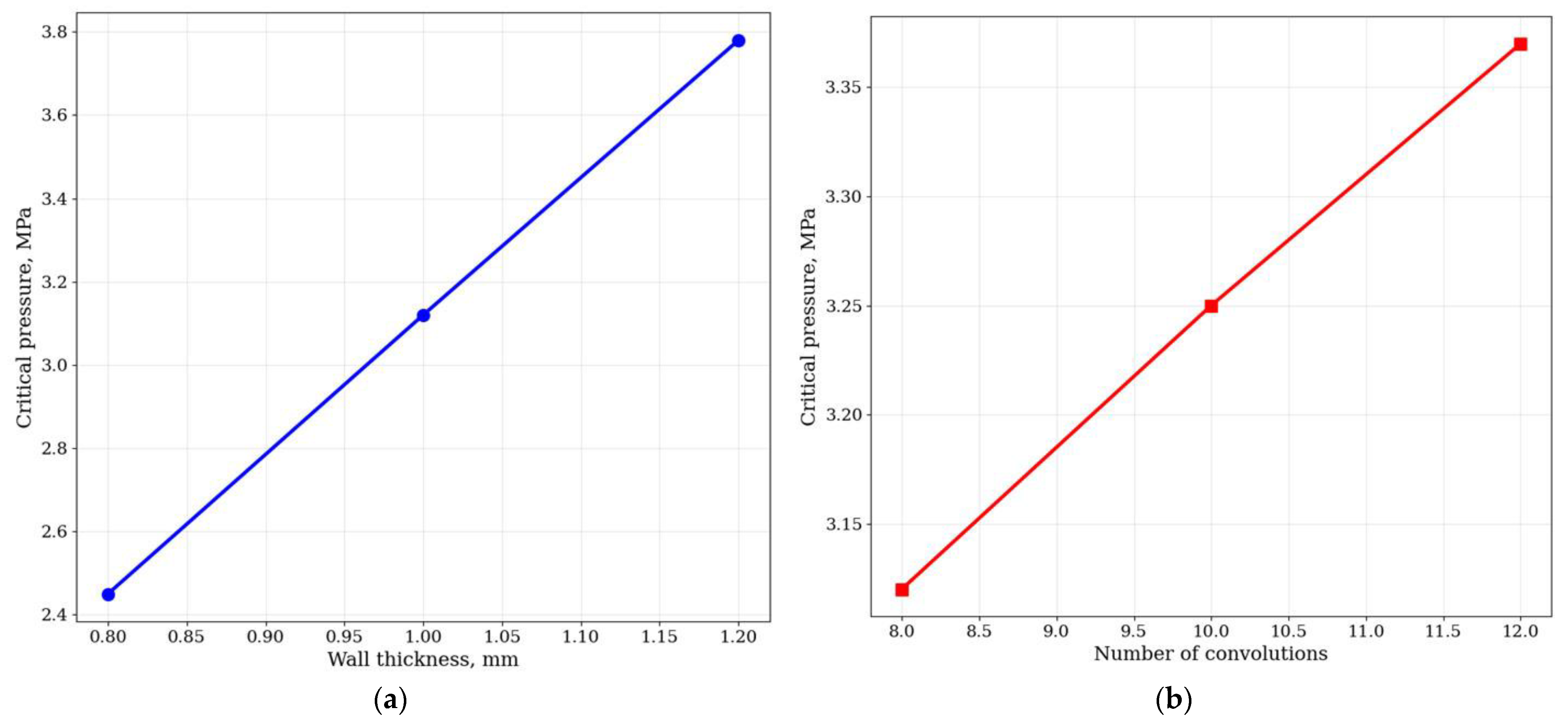 Parametric studies not only determine critical loads but also assess the reliability margin of the structure when varying key parameters. The established dependencies between geometry and critical pressure make it possible to develop recommendations for the design of expansion joints with increased service life and resistance to various types of loading.