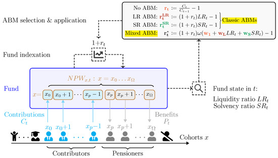 The work is organized as follows. Section 2 outlines the pension system specifications, defines the stochastic dynamics of the considered sources of uncertainty, and introduces the two ratios needed later to define the ABMs. Section 3 defines the classic liquidity- and solvency-based ABMs, generalizes them to the mixed ABM proposed in this work, and defines all the optimization problems that must be solved jointly to find the suboptimal ABM that guarantees improvements for both the social utility and financial sustainability of the considered pension system. Section 4 presents our numerical results, both discussing a specific optimization problem in detail and providing an overview of the cases when mixed ABMs must be preferred over the classic ones. Finally, Section 5 summarizes the results obtained in this work and discusses related open problems that are worth investigating in future research papers.