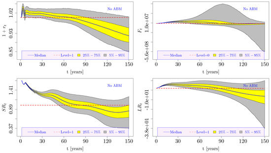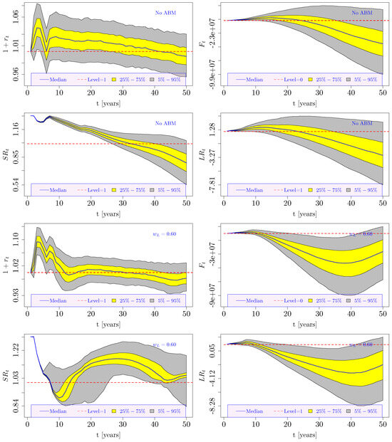 As all our numerical simulations implement stabilization of the pension system through the substitutions reported in Equation (41), we choose to reduce the mixed ABM by imposing . In the process, Equations (38) and (39) are simplified as follows: