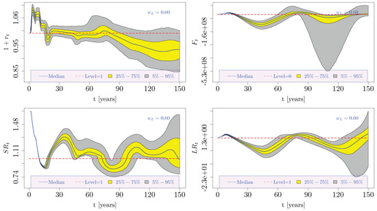 Simulated dynamics of , , , and (50-year-long projection horizon). The specifics are the same as those considered in Figure 7, except for , as calibrated in the “2015 Italian” setting, and , which is set to .