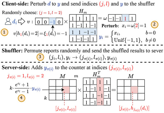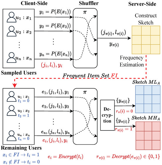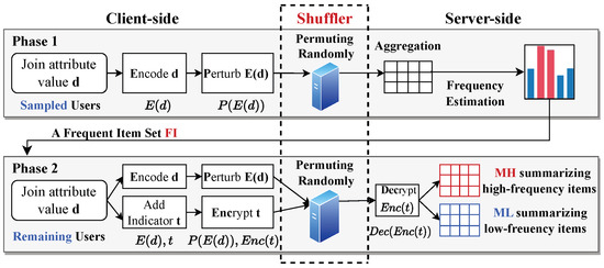 Figure 1 depicts the workflow of our proposed method, which is structured into two phases. Note that we divide the users into two groups by sampling for the tasks of the two phases, rather than directly dividing the privacy budget as in most previous works [11,15,21], since a smaller privacy budget introduces a significant amount of noise being added, thus leading to unacceptable utility. Initially, the first phase focuses on identifying frequent items among the sampled users. Each user on the client side encodes (abbreviated as ) and perturbs (abbreviated as ) their private attribute value d and submits the sanitized result to the shuffler. The shuffler then randomly permutes the reports from n users to achieve anonymization and then sends the shuffled results to the server for aggregation. The server first constructs a sketch with the permuted results and then estimates the frequencies to obtain the frequent item set () based on the sketch. The server broadcasts to the remaining users. In the second phase, the outcome from the first phase is used to differentiate between high- and low-frequency items, improving the precision of the join size estimation. Based on , an indicator t is assigned to each user, denoting whether an item is high-frequency or low-frequency. Specifically, if the private value of user i is in , then ; otherwise, . Similar to the first phase, each user encodes and perturbs d. Additionally, each user encrypts (abbreviated as ) the indicator t. Sanitized results and for each user are transmitted to the shuffler for permutation. On the server side, it separates high-frequency and low-frequency items by the decryption (abbreviated as ) results , and constructs sketches and to summarize the corresponding items.