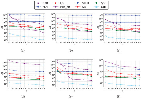 Impact of the privacy budget on the estimation accuracy of join size. (a) Zipf (); (b) Zipf (); (c) Zipf (); (d) Twitter; (e) Gaussian; (f) Facebook.