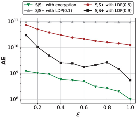 Comparison between encryption and LDP perturbation for frequency property in SDPJoinSketch+. To verify the effectiveness and necessity of using secure encryption methods on frequency properties in SJS+, we compare it with traditional differential privacy methods that add noise to the properties. Note that the information uploaded by users in the second phase can be regarded as a two-dimensional value, i.e., the value to be inserted to the sketch and the frequency property t. Therefore, the privacy budget needs to be divided to satisfy local differential privacy. Figure 11 shows the results of AE comparison between using encryption and directly adding LDP noise to the frequency properties on Zipf (), where we fix , . The decimal values in parentheses indicate the portion of the privacy budget allocated to the frequency properties. We can find that the encryption technique outperforms the LDP methods. And the more randomness added to the frequencies, the lower the estimation accuracy, which further demonstrates the necessity of preserving the true information of frequency properties.