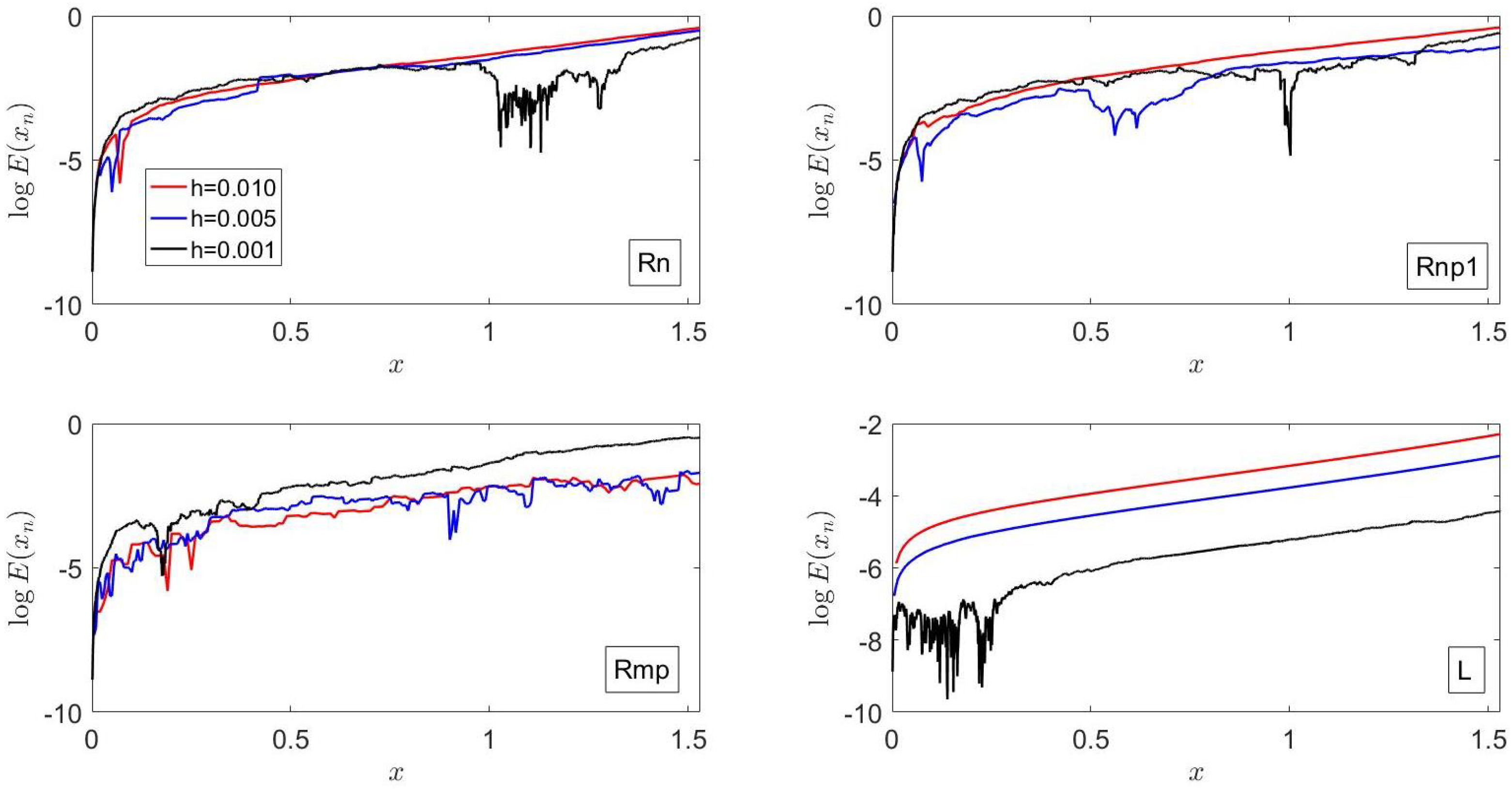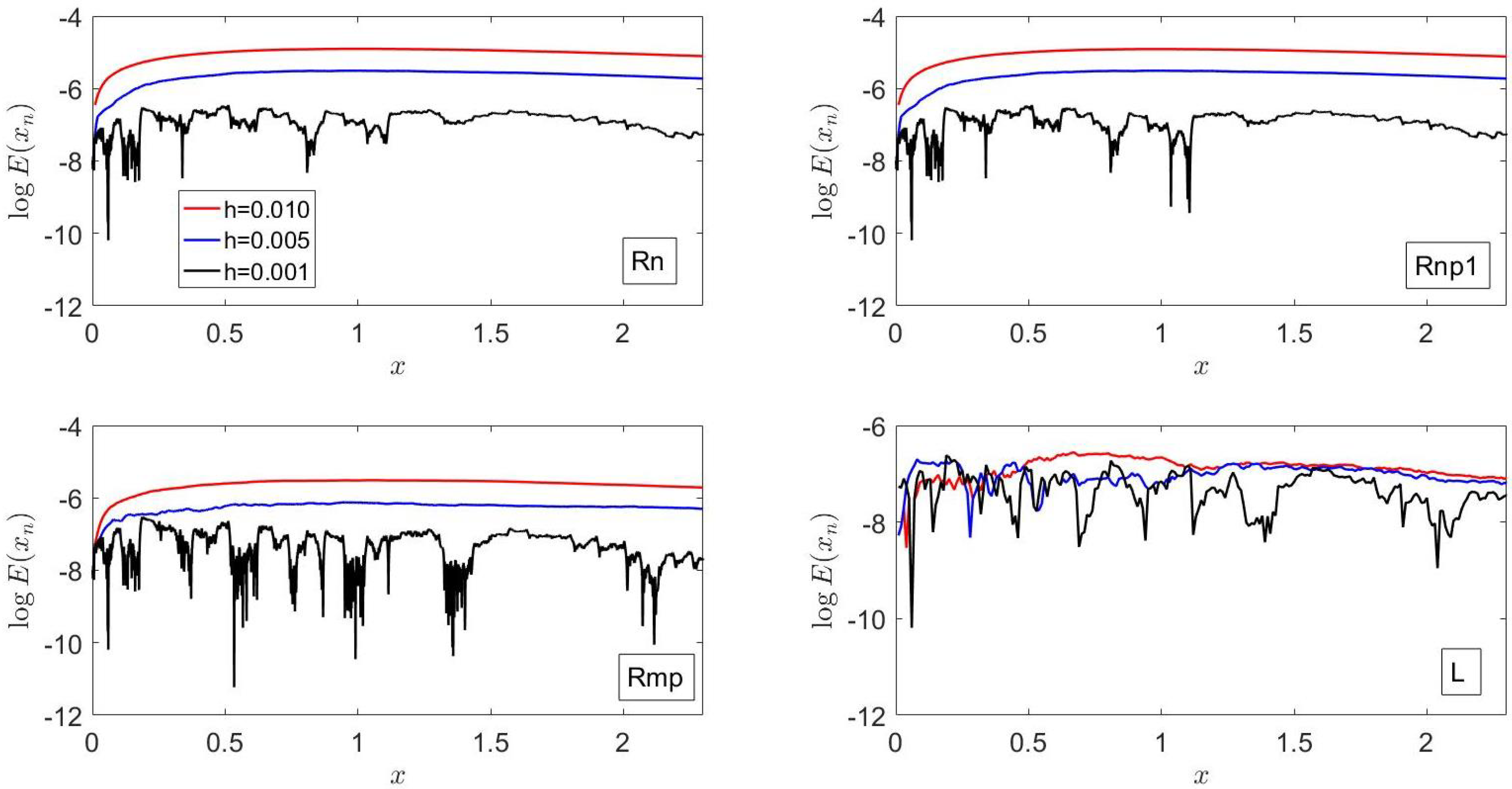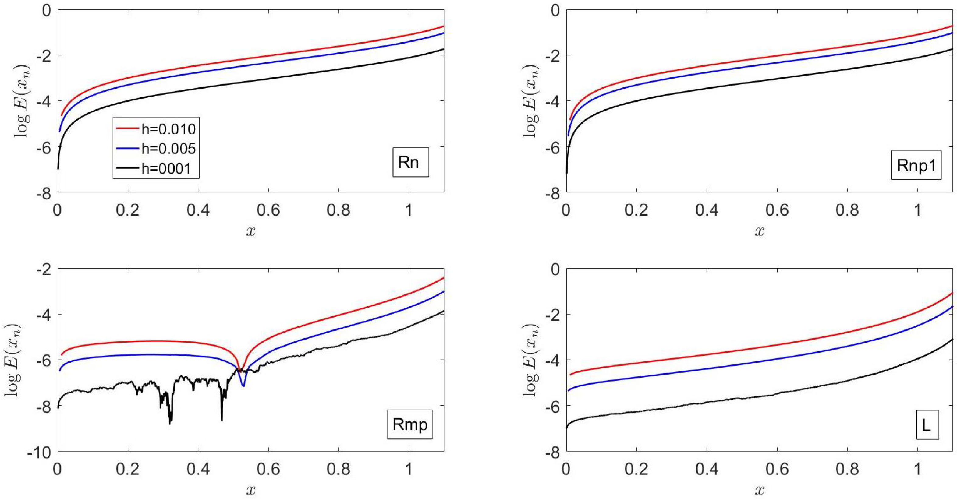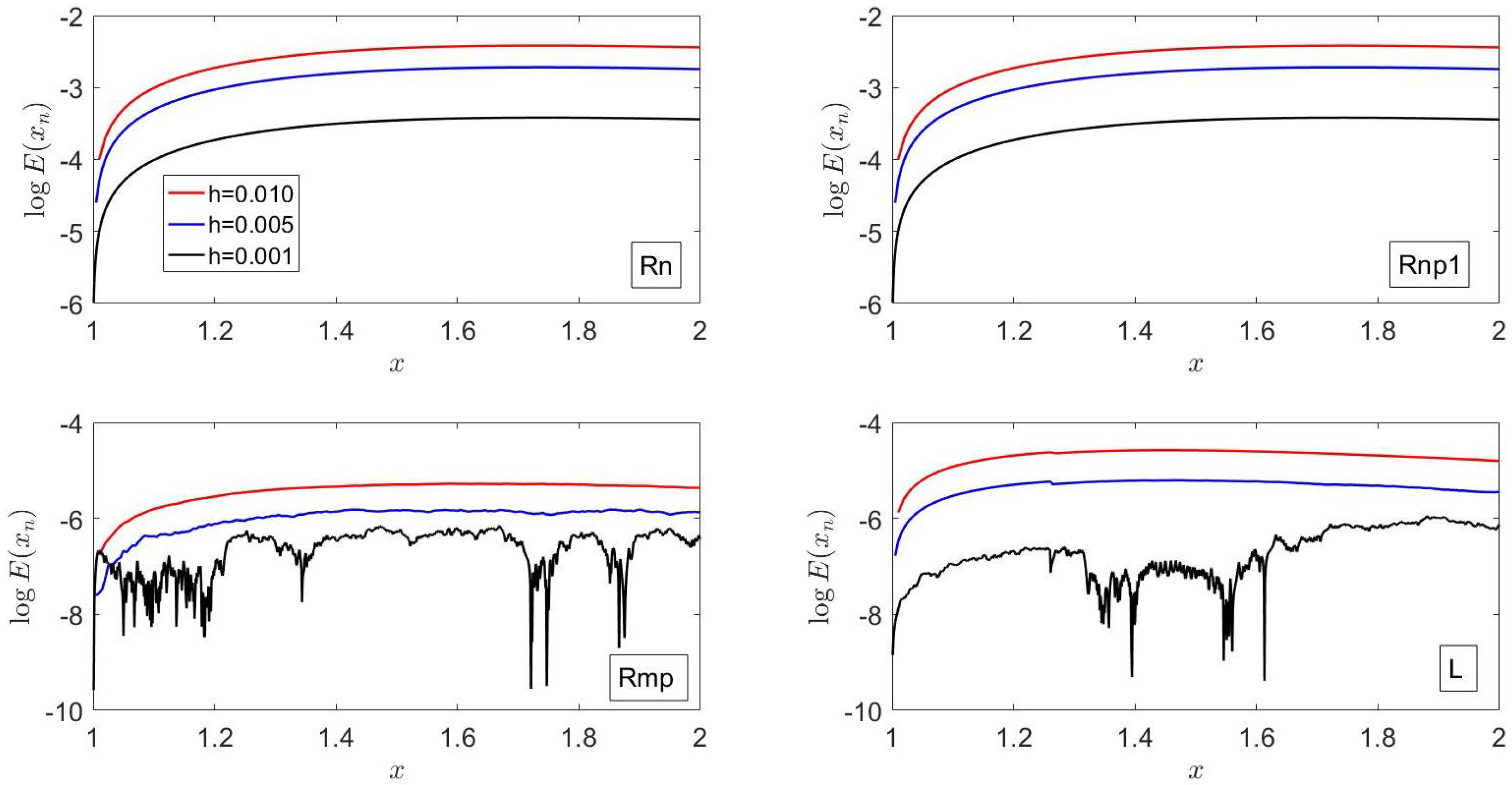 For the five examples considered in this section, except example 2, the accuracy of Rn is very close to that of Rnp1, and the accuracy of Ln is very close to that of Lnp1 for examples 1, 2 and 4 and example 5 with , but lower than that of Lnp1 for example 3.