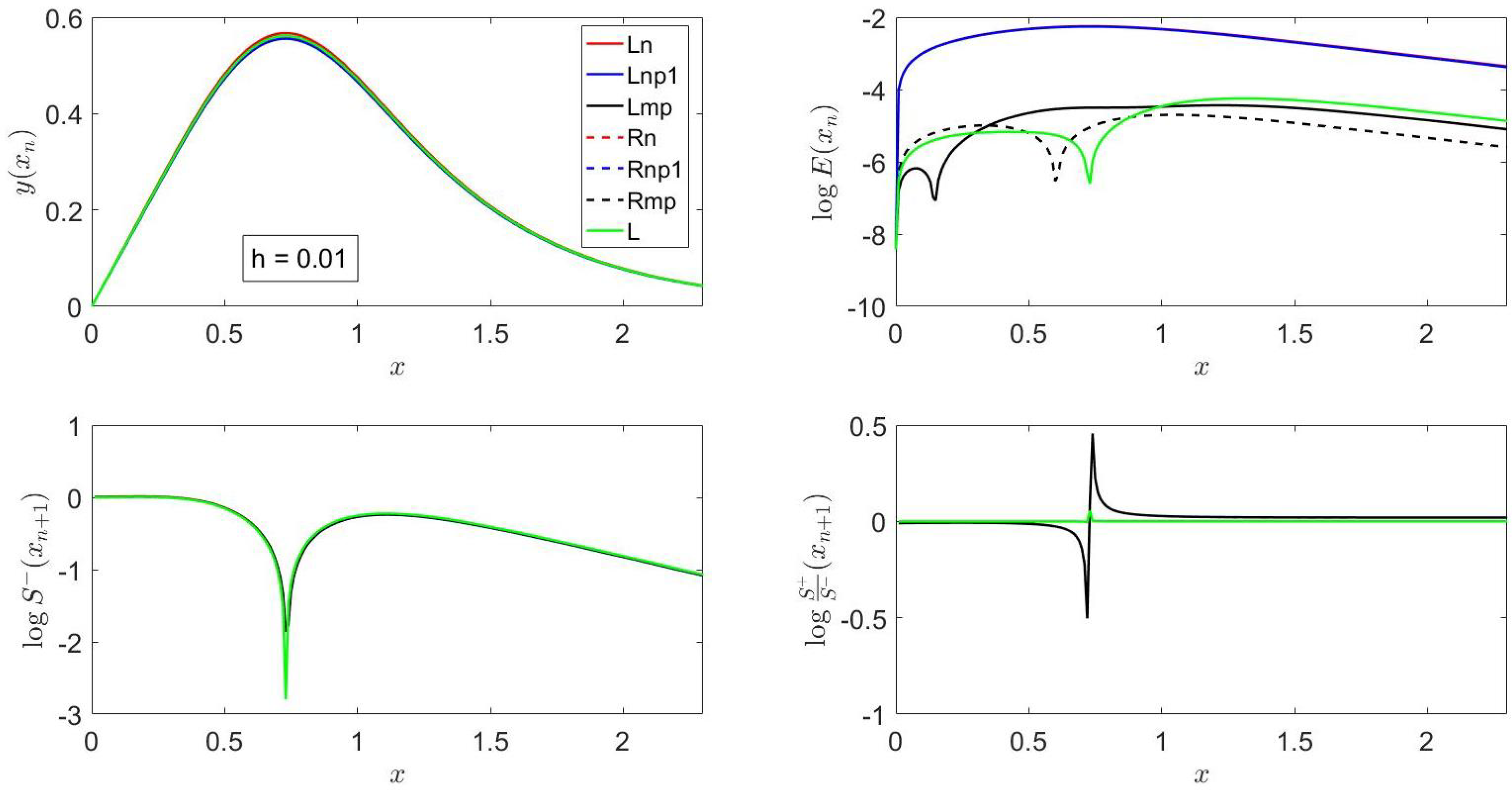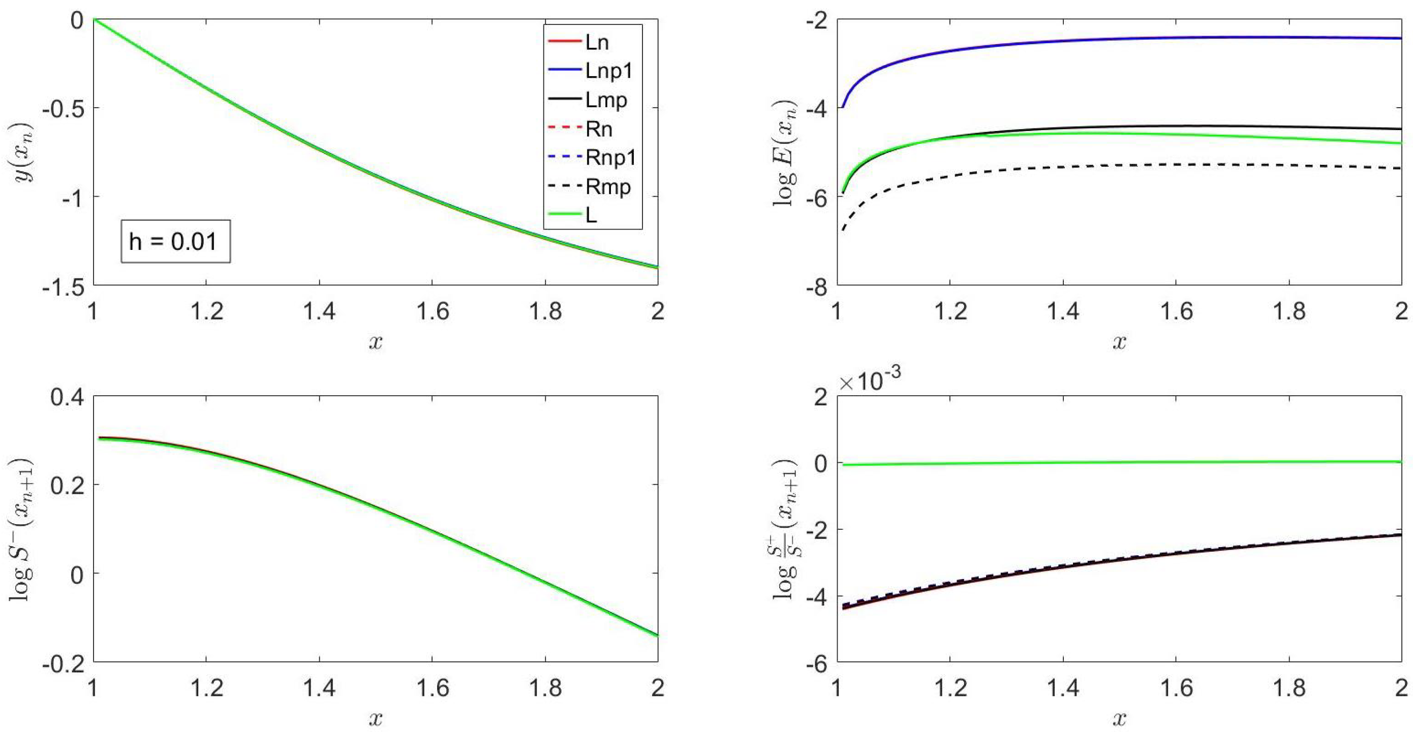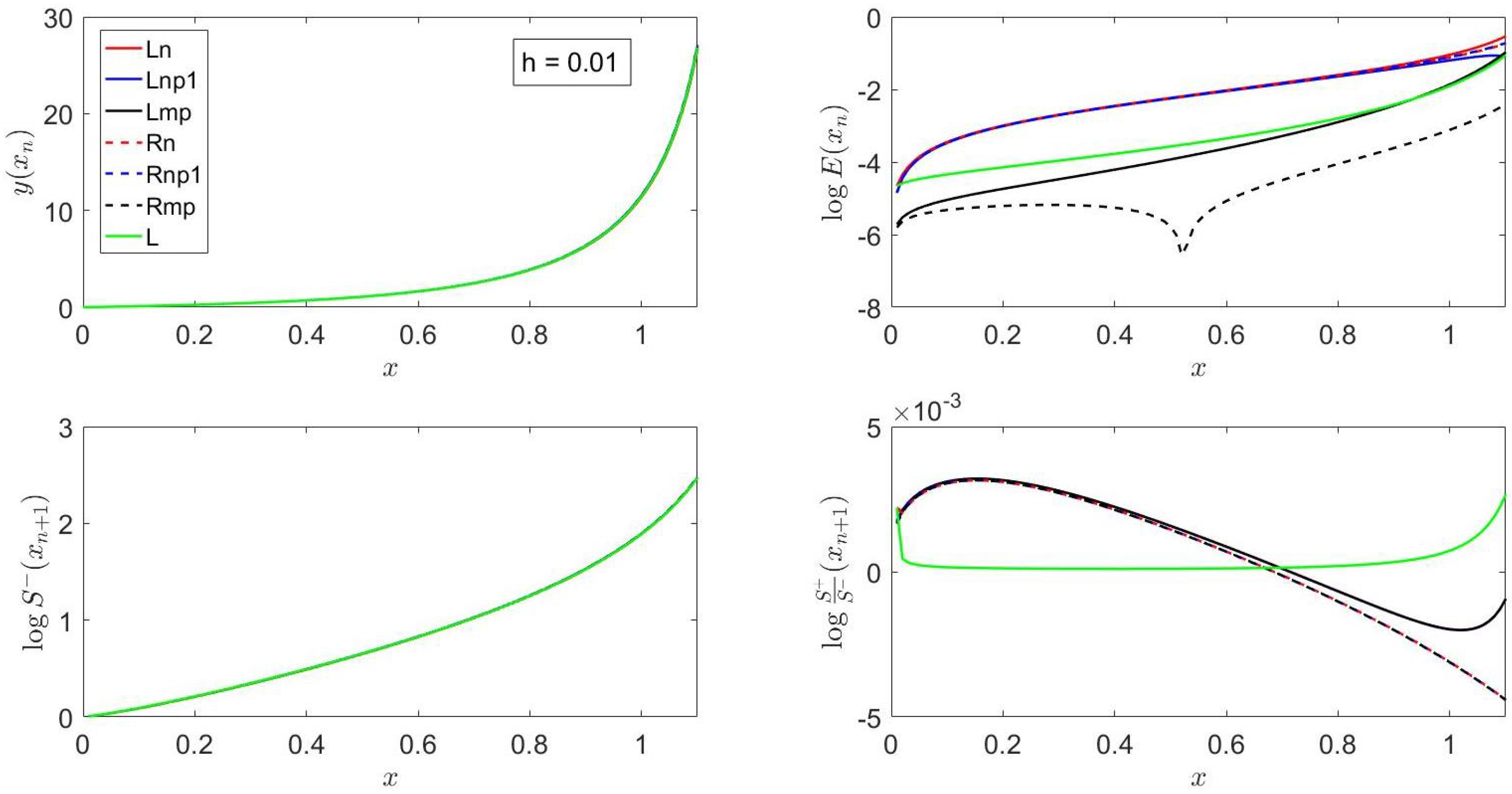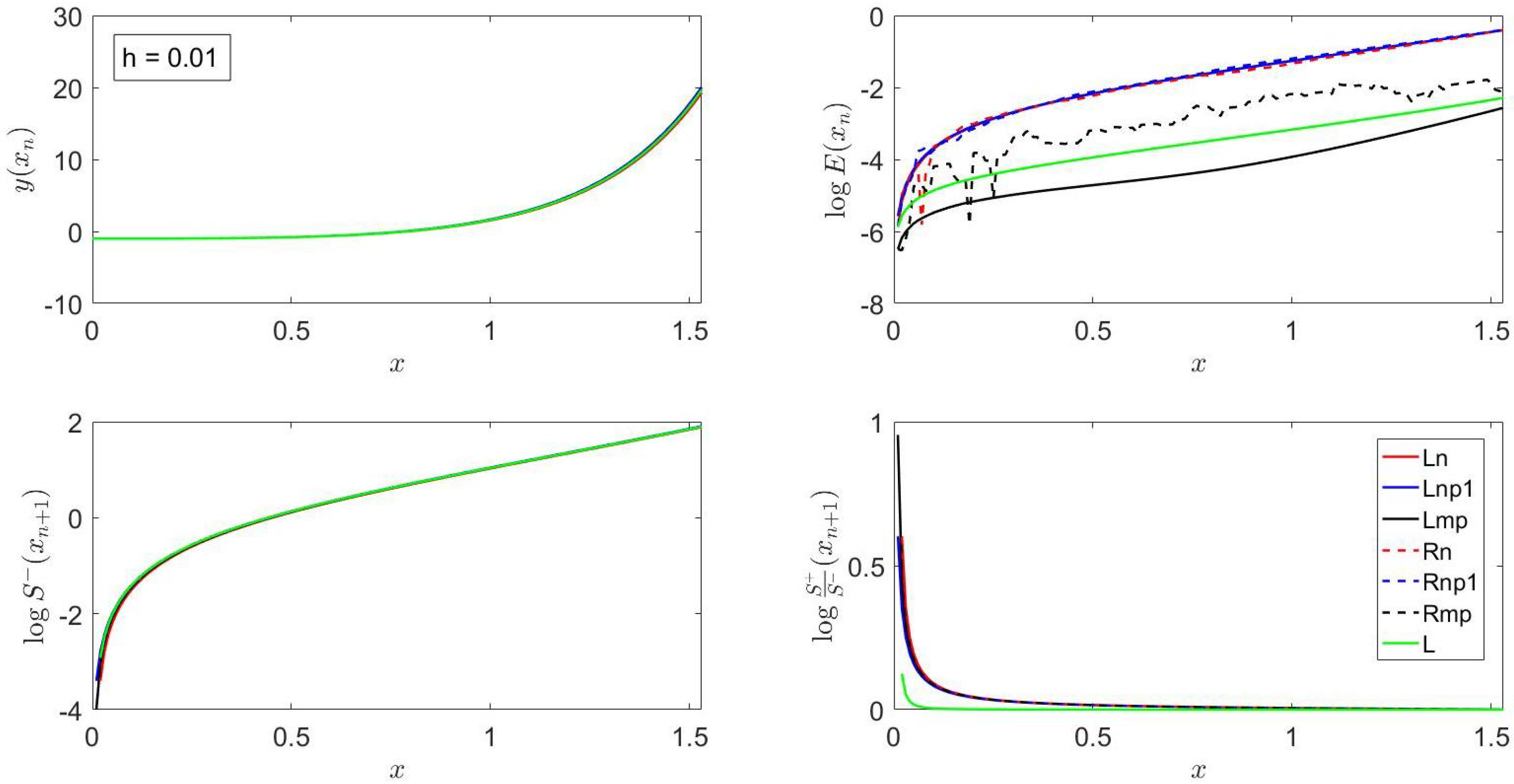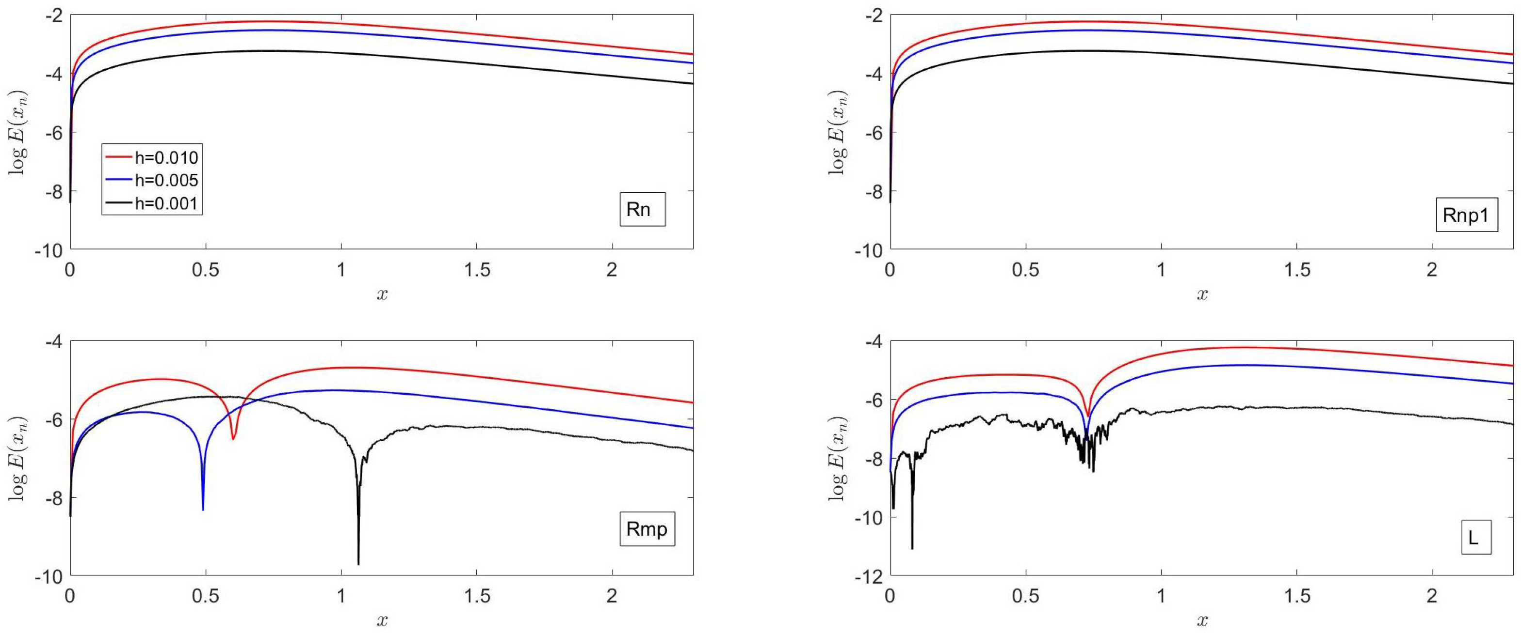 For the five examples considered in this section, except example 2, the accuracy of Rn is very close to that of Rnp1, and the accuracy of Ln is very close to that of Lnp1 for examples 1, 2 and 4 and example 5 with , but lower than that of Lnp1 for example 3.