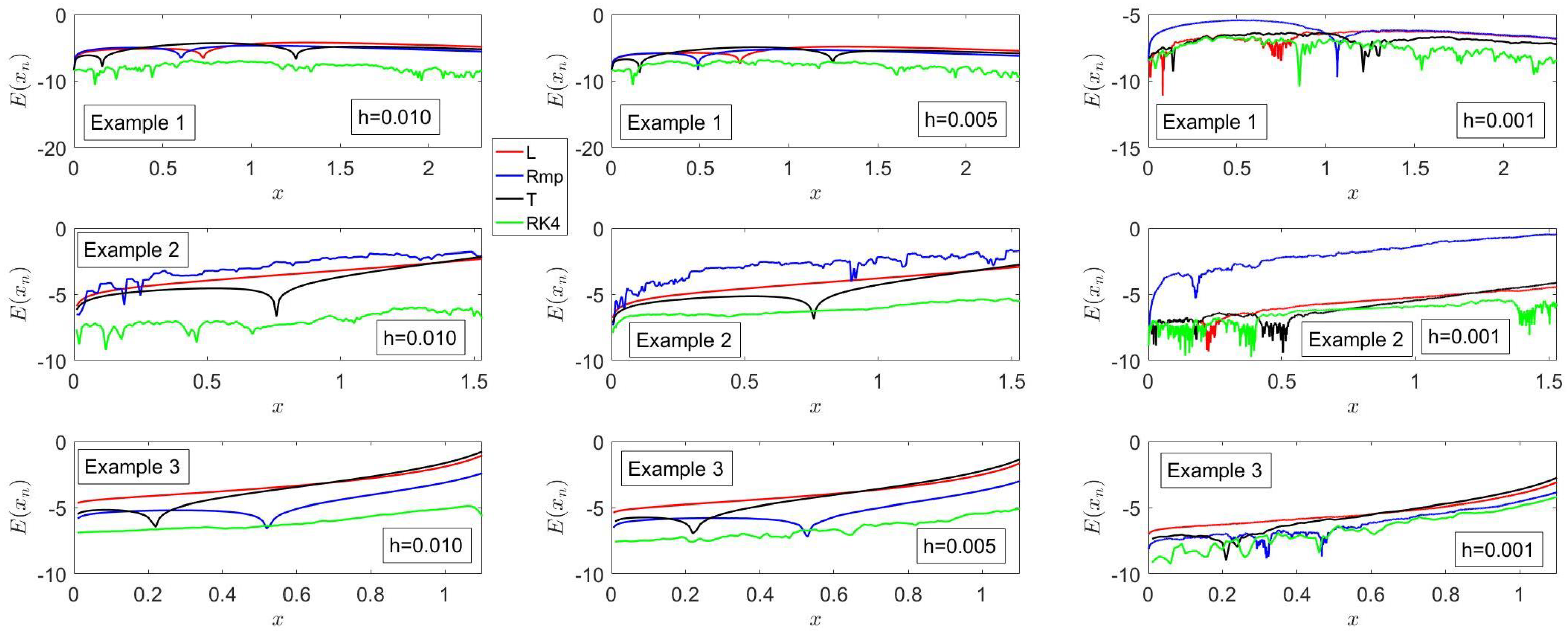 RK4) are presented for the five examples considered in the manuscript. Such comparisons are made in terms of the error with respect to the exact solution and for three different step sizes and are illustrated in