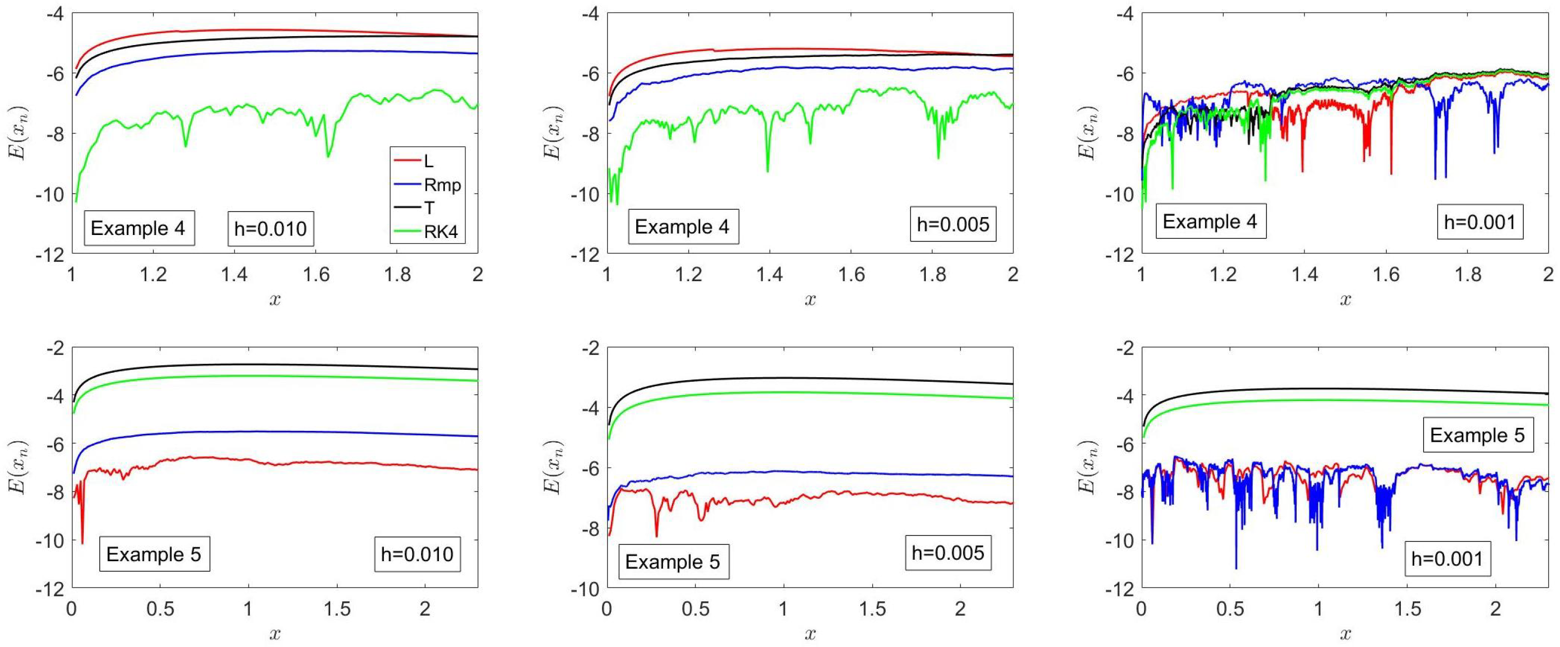 For Examples 2 and 3, the ordering of accuracy is RK4, T, Rmp and L, and RK4, Rmp, T and L, respectively. As stated previously, the solution to example 2 is an exponentially growing one, whereas that of example 3 exhibits blowup in finite time.