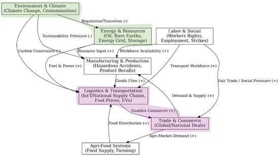 Conceptual system-of-systems representation of global green supply chain disruptions. The figure illustrates how environmental, energy, logistics, manufacturing, agri-food, and labor domains are interdependent, showing how shocks in one domain cascade across others.