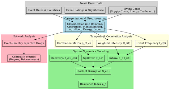 Conceptual framework of the methodology. The figure illustrates the transformation of raw news event data into categorized domains, temporal and correlation analysis, system dynamics modeling of disruptions and resilience, and network analysis of event–country relationships.