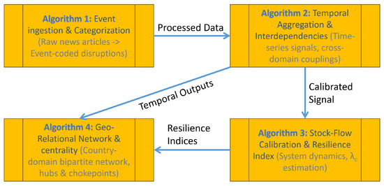 This subsection translates the methodological pipeline into implementable steps. We provide modular procedures for (i) ingestion and systemic categorization, (ii) temporal aggregation and interdependency estimation, (iii) stock–flow calibration and resilience computation, and (iv) geo-relational network construction. Pseudocode assumes access to the event table with fields dfs_eventcode, dfs_eventdate, dfs_rating, dfs_firsteventcountry/dfs_secondeventcountry, and the domain-mapping function introduced earlier. References to , , , , , , , and follow Equations (3)–(9).The four core algorithms form a sequential pipeline: Algorithm 1 ingests raw news reports and converts them into event-coded disruptions, Algorithm 2 aggregates temporal signals and estimates interdependencies, and Algorithm 3 calibrates stock–flow dynamics to compute resilience indices. Algorithm 4 then integrates outputs from Algorithms 2 and 3 into a geo-relational network, highlighting systemic hubs and chokepoints. Figure 3 clearly shows this interaction.