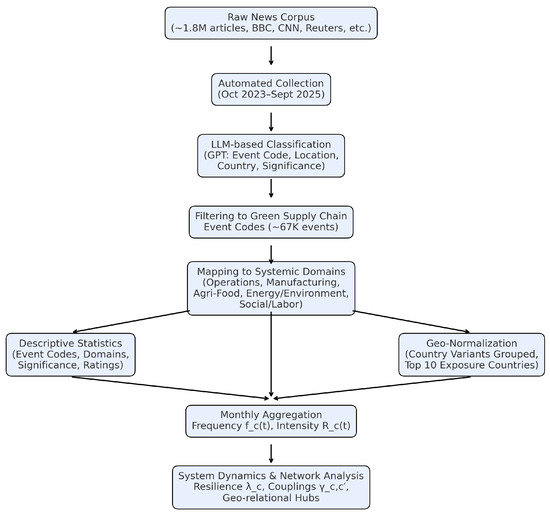 This section describes the experimental setup, dataset, preprocessing, and descriptive statistics used to evaluate the proposed methodology. The raw corpus comprised approximately 1.8 million news articles collected autonomously from global portals (BBC, CNN, Washington Post, New York Times, Daily Mail UK, NDTV India, 9 News Australia, Reuters, among others), covering the period from October 2023 to September 2025. Large language model (GPT)–assisted classification was employed to annotate each record with event code, event location(s), country(ies), and event significance. Our most recent publications have clearly shown GPT-based classification design along with comprehensive evaluations [34,35,36,37]. According to [34,35,36,37], the accuracies and F1-scores of GPT-based classifications employed in this study could reach up to 0.925. Filtering to retain only those events related to green supply chains produced a final analytical dataset of 67,434 coded events. Event codes were grouped into five systemic domains (Operations, Manufacturing, Agri-Food, Energy/Environment, and Social/Labor) for systems analysis. To ensure research reproducibility and facilitate open validation within the scientific community, the dataset comprising 67,434 news-derived events generated for this study has been made publicly accessible at https://github.com/DrSufi/EventSystemGSC (accessed on 13 September 2025).