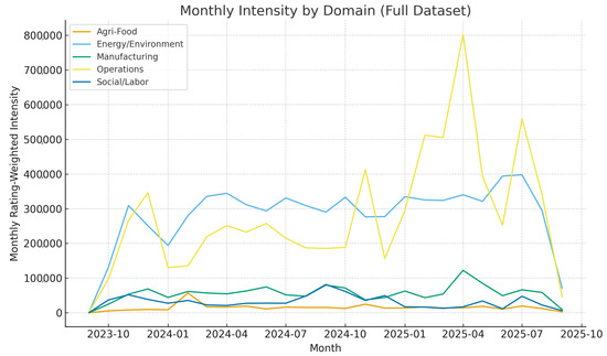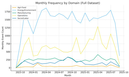 Mapping event codes into domains reveals that Energy/Environment dominates (44,102 events), followed by Operations (10,714). The least represented is Agri-Food (2861). Table 5 summarizes the distribution.