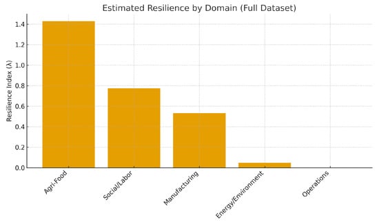While the parameters , , and are calibrated through the stock–flow dynamics, it is important to note that their choice may influence resilience outcomes. To mitigate this concern, we validated the stability of the resilience index by conducting rolling-origin checks across multiple temporal windows and by comparing domain-level results under alternative parameter initializations. The findings consistently preserved the relative fragility ranking of domains (Energy/Environment and Operations remaining the weakest), indicating that the conclusions are robust to parameter variation. Future work could formalize this through full-scale sensitivity analysis and cross-validation, further strengthening confidence in the resilience estimates.