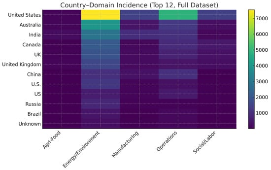 Domain-specific incidence of supply chain disruptions across the top 12 countries (full dataset, standardized country names). The figure shows that the United States and Australia are heavily exposed in Operations and Energy/Environment, whereas India and China display more balanced exposure across domains.