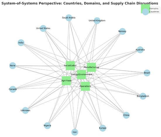 The complexity of global green supply chain disruptions can be better understood through a system-of-systems perspective, where countries act as geo-political exposure hubs and systemic domains (Operations, Manufacturing, Agri-Food, Energy/Environment, Social/Labor) represent the structural layers of global supply chains. Disruptions serve as the interlinkages that bind these layers, transmitting shocks across multiple domains and national contexts. This perspective is particularly important because it highlights how vulnerabilities are not isolated but are shaped by the interplay between geographic exposure and functional interdependence.