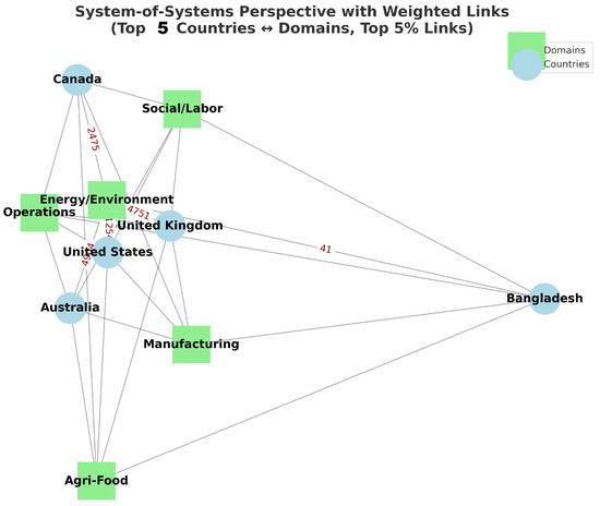 Figure 9 illustrates the overall system-of-systems network, where green squares denote systemic domains and blue circles denote countries. The figure demonstrates how disruptions are distributed across multiple layers of the supply chain system. Countries such as the United States, the United Kingdom, Australia, India, and China emerge as central nodes, connected to nearly all domains. This centrality indicates that shocks in these nations are more likely to cascade globally due to their multi-domain exposure.