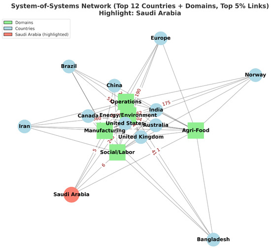 System-of-systems network of the top 12 countries, highlighting Saudi Arabia (red node). Link values show that Saudi Arabia’s strongest dependency is on the Energy/Environment domain (>300 events), followed by weaker connections to Operations (<50 events).