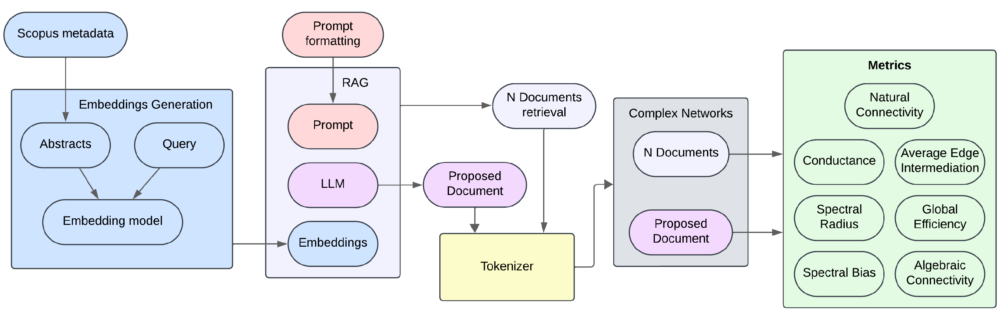 - We propose a two-phase framework that separates generation from evaluation, in which a simple retrieval-augmented generation (RAG) system produces scientific abstracts, and their semantic coherence is assessed independently using graph-theoretic analysis.