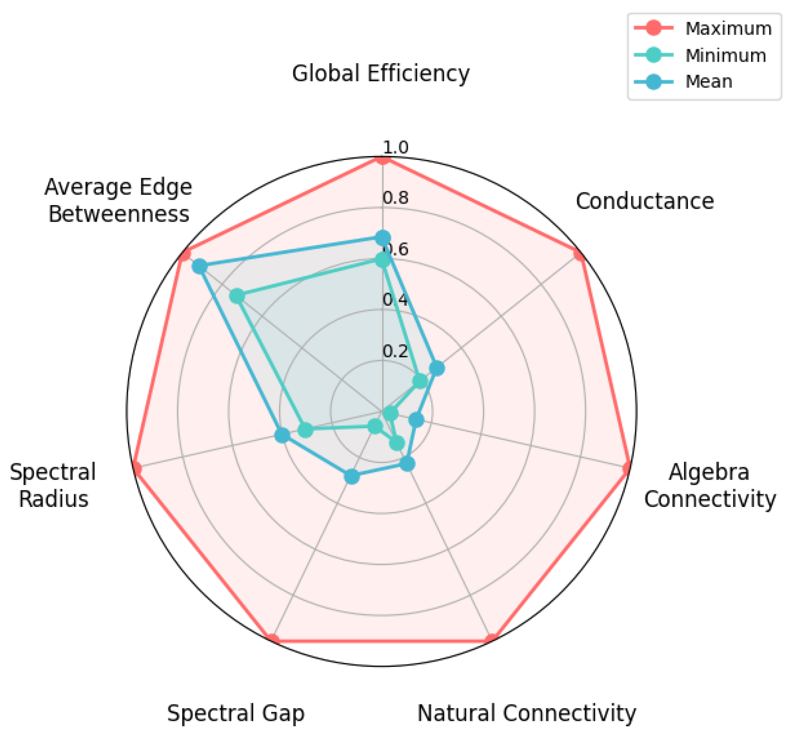 | Temperature | Global Efficiency (↑) | Avg. Edge Betweenness (↑) | Spectral Radius (↑) | Spectral Gap (↑) | Natural Connectivity (↑) | Algebra Connectivity (↑) | Conductance (↑) |