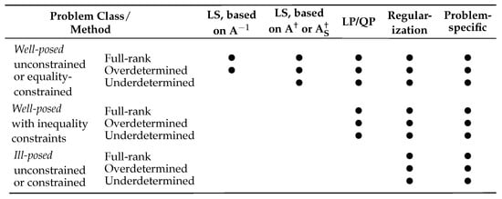 The final frontier that motivates the formulation of a new framework is the class of ill-posed problems in Hadamard’s sense [4] (pp. 143, 241), i.e., systems with no (i) feasibility, , (ii) uniqueness, , (iii) stability, , or formulation—as a well-posed LS, LP, or QP problem—of solution under mainstream assumptions, where , , and , such as the ones described in Bolotov [15], Bolotov [16]: namely, (a) underdetermined, , and/or ill-conditioned linear systems, , , in cases of LS and LP, where solutions are either non-unique or highly sensitive to perturbations [22,73]; and (b) degenerate, , with cycling behavior, , and , , in all LP and QP problems, where efficient methods, such as the simplex algorithm, may fail to converge [27,74]. Such problems have been addressed since the 1940s–1970s by (a) regularization (i.e., a method of perturbations) and (b) problem-specific algorithms [2] (pp. 455–630). For LS cases, the list includes, among others, Lasso, Ridge regularization, and Elastic Net [4] (pp. 477–479), constrained LS methods [75], restricted LS [76], LP-based sparse recovery approaches [73], Gröbner bases [77], as well as derivatives of eigenvectors and Nelson-type, BD-, QR- and SVD-based algorithms [78]. For LS and QP, among others, we have Wolfe’s regularization-based technique for simplex [25] and its modifications [27,74], Dax’s LS-based steepest-descent algorithm [26], a primal-dual NNLS-based algorithm (LSPD) [79], as well as modifications of the ellipsoid algorithm [80]. A major early attempt to unify (NN)LS, LP, and QP within a single framework to solve both well- and ill-posed convex optimization problems was undertaken by Übi [28,29,30,31,32], who proposed a series of problem-specific algorithms (VD, INE, QPLS, and LS1). Figure 2 compares all the mentioned methods by functionality.