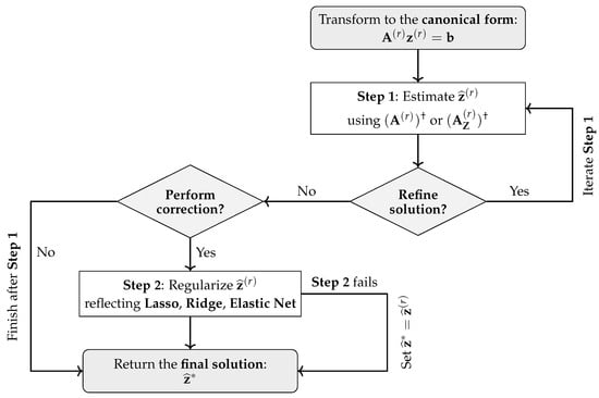 To accommodate the above-described problem classes, a modular two-step CLSP consists of a first (compulsory) step—minimum-norm LS estimation, based on or (hereafter denoted as to match )—followed by a second (optional) step, a regularization-inspired correction. This structure ensures that CLSP is able to yield a unique solution under a strictly convex second-step correction and extends the classical LS framework in both scope and precision, providing a generalized approach that reduces the reliance on problem-specific algorithms [28,29,30,31,32]. The estimator’s algorithmic flow is illustrated in Figure 4 and formalized below.