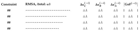which is a diagnostic interval based on the condition number for , consisting of (1) a canonical-form system conditioning, , (2) a normalized model misfit, , and (3) the “scale” of the final solution, , without probabilistic assumptions. A perturbation in one or more of these three components, e.g., caused by a change in RMSA resulting from dropping selected constraints (consult Section 4), will affect the limits of . Under a perfect fit, the interval collapses to and, for , tends to be very wide. Overall, in practical implementations, where the squared perturbations may violate the uniformity simplification, an aggregated (e.g., average) width of the diagnostic interval for vectors and becomes more informative, as it represents an adjusted goodness-of-fit statistic—normalized error weighted by the condition number of the design matrix .