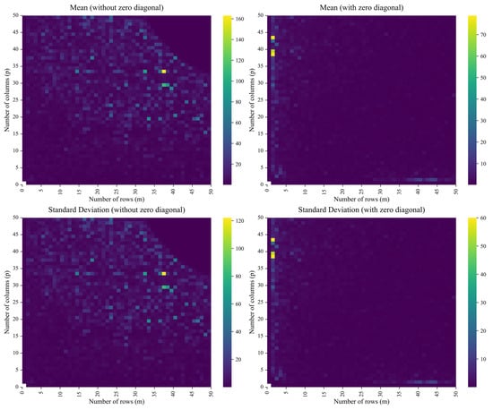 Heatmaps (based on seaborn’s viridis colormap) of means, , and standard deviations, , computed from the NRMSE of , where , under two structural variants: with and without a zero diagonal (). Color reflects the magnitude of the statistic, with lighter shades indicating higher values. The figure was prepared using matplotlib in Python 3.