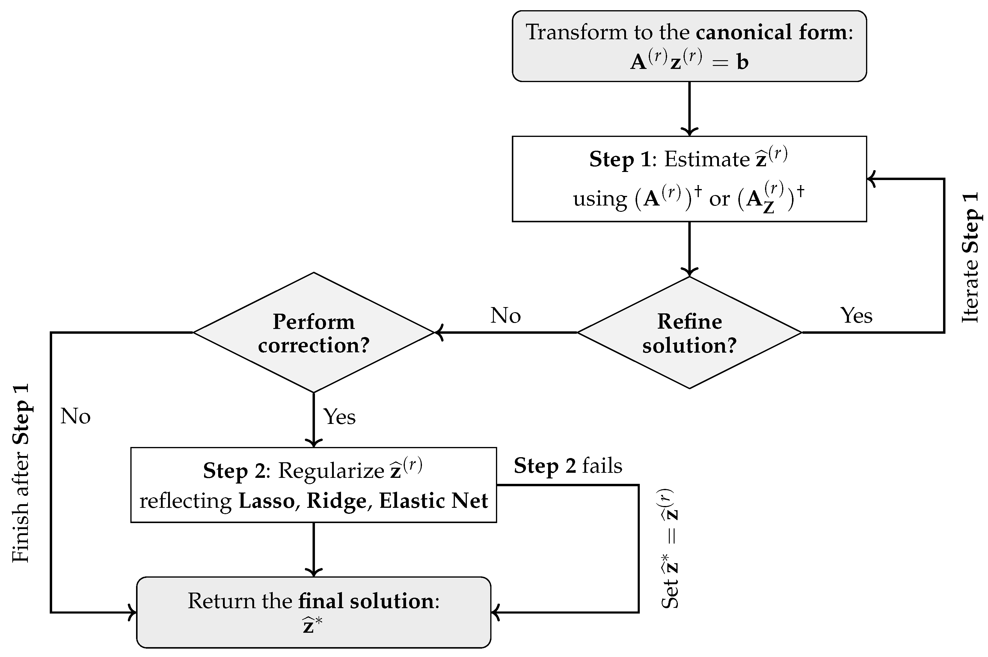 2], provides an optional correction of the first step, drawing on the logic of Lasso, Ridge, and Elastic Net to address ill-posedness and compensate for constraint violations or residual approximation errors resulting from the first-step minimum-norm LS estimate. Hence, it can be claimed that the proposed framework is grounded in the general algorithmic logic of Wolfe [