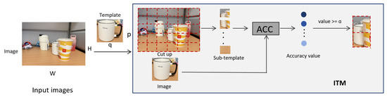 Figure 5, we input a template image and the input image, after the FTM algorithm is used, to obtain a similarity matrix. If the maximum in the similarity value matrix is considered to be the best matching region, we will take this part of the region as a sub-template image and template image for ITM. The sub-template image is partitioned into four templates, comprising each template and the original template image for ITM, retaining the minimum difference value of each with the sub-template image. Eventually, the average of the similarity values of the matched regions of the four sub-templates is the similarity value of the ITM output. In