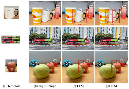 Figure 6, the FTM algorithm obtains a similarity value of 0.51, while the ITM algorithm obtains a similarity value of 0.90, and the ITM algorithm obtains a more accurate match. Thus, reverse template matching shows significantly better performance than forward matching in this case and it is able to identify the target area more accurately, especially in the processing of an occluded part. Moreover,