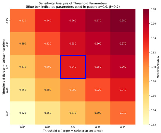 This sensitivity analysis was conducted to rigorously validate our empirical selection of thresholds and . As visualized in the heatmap, these parameters achieve a high accuracy of 0.94 and are situated within a stable, high-performance region, confirming their robustness. Furthermore, while peak accuracy (0.98) occurs at stricter settings (, ), our chosen values represent a deliberate and optimal balance, delivering state-of-the-art performance while avoiding the computational inefficiency and over-restrictive matching associated with excessively high thresholds, thus ensuring greater practical utility.