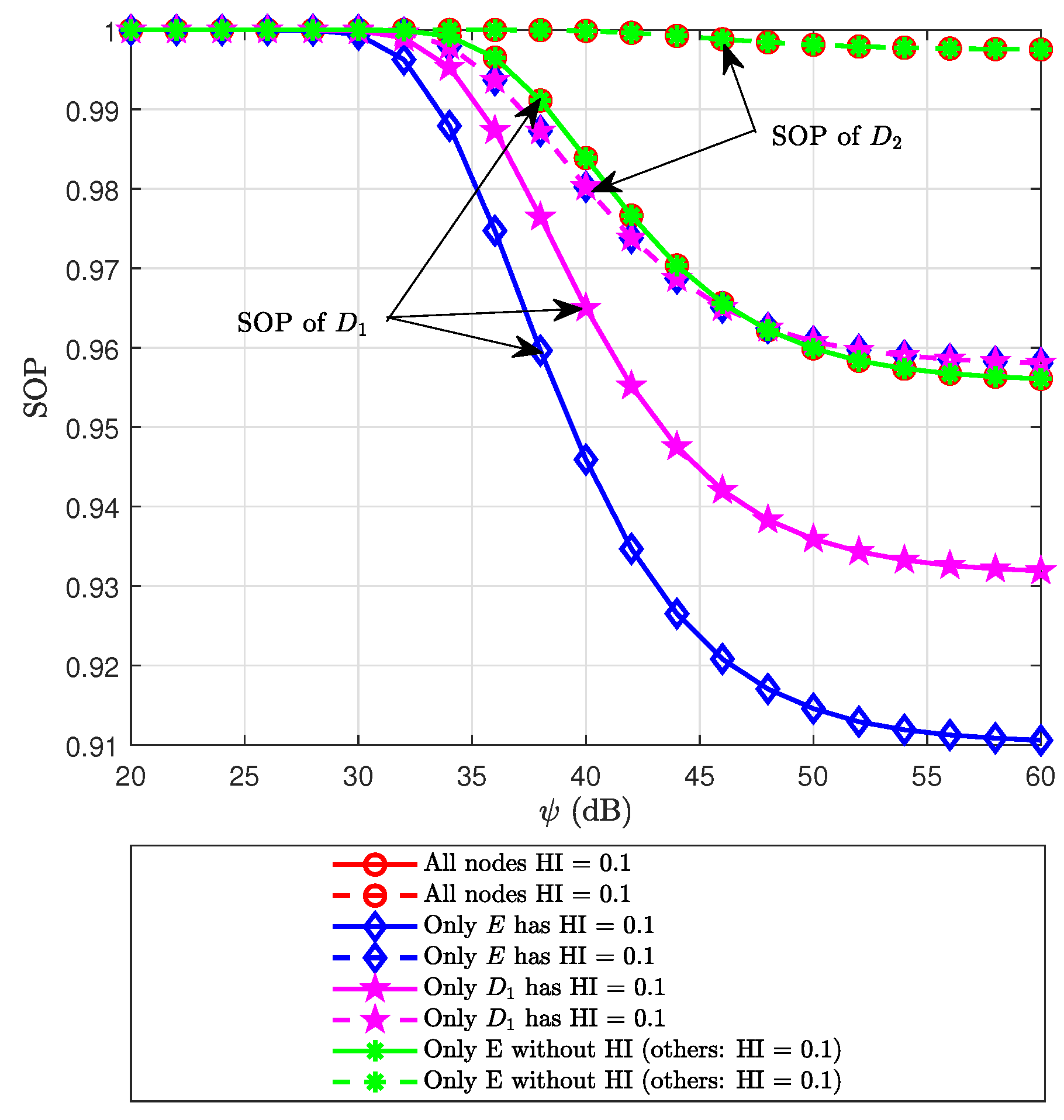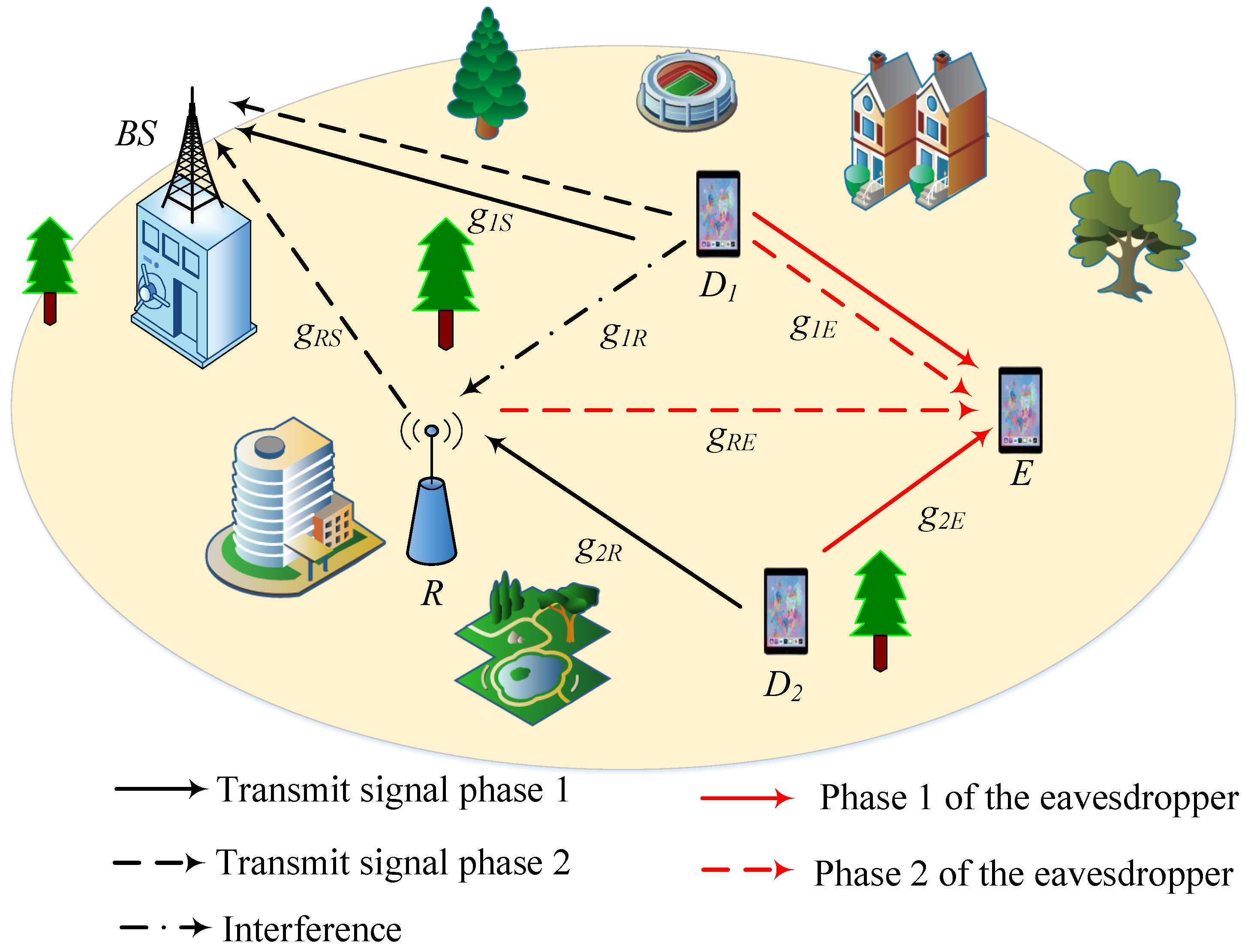 - A secure uplink NOMA system is proposed, where user 1 () and user 2 () transmit signals to the via an R considering the presence of a potential E and the impact of HIs on all devices.