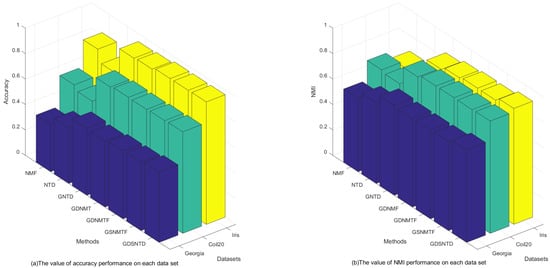 - From Table 3, we can observe that our proposed method of GDSNTD can also achieve higher accuracy. The NMI of GDSNTD is as high as 50.16% on the Iris dataset, which is 34.95%, 7.46%, 4.27%, 3.49%, and 3.42% better compared with NMF, GNTD, GDNMF, GDNMTF, and GSNMTF, respectively. In the Georgia dataset, the accuracy of GDSNTD is also improved by 26.67%, 15.01%, 3.12%, 4.79%, 4.54%, and 4.26% compared with other co-clustering algorithms NMF, NTD, GNTD, GDNMF, GDNMTF, and GSNMTF, respectively. In the Coil20 dataset, the accuracy of GDSNTD is improved by 21.02%, 23.85%, 2.75%, 0.3%, 0.2%, and 0.32%, compared with other co-clustering algorithms NMF, NTD, GNTD, GDNMF, GDNMTF, and GSNMTF, respectively.