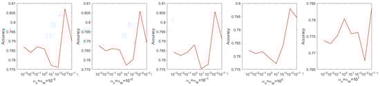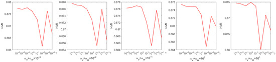Every parameter is searched over a range of values from 0 to . The choice of parameters has a pronounced effect on experimental performance; therefore, they were selected systematically through a grid search. Figure 4 shows the process of determining the optimal parameters using a grid search on the Iris dataset. From Figure 4, we can see that the accuracy is only when and . When the coefficient of the sparse regularization term is , the accuracy improves to . From Figure 5, it is to be observed that the NMI is when and , and when the coefficient of the sparse regularization term is , the accuracy is only .