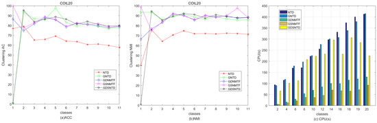 - Table 4 shows that the average AC of GDSNTD is higher than that of the other methods on most datasets. In the Georgia dataset, the accuracy of the co-clustering algorithm GDSNTD is improved by an average of 27.4%, 22.6%, 2.2%, 8.7%, 5.11%, and 3.79% compared with NMF, NTD, GNTD, GDNMF, GDNMTF, and GSNMTF, respectively. From Table 6, it can be observed that on the Coil20 dataset, the accuracy of GDSNTD is, on average, 23.9%, 30.9%, 1.49%, 4.0%, 5.79%, and 3.18% higher than that of NMF, NTD, GNTD, GDNMF, GDNMTF, and GSNMTF, respectively.