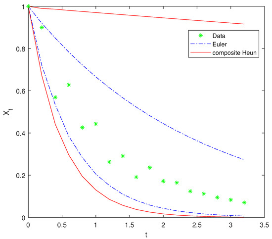 Step 4. According to the observations obtained in Step 3, compute the moment estimate of via the composite Heun scheme by using MATLAB (MATLAB R2023a, 23.2.0.2358603, maci64, Optimization Toolbox, “fsolve” function).