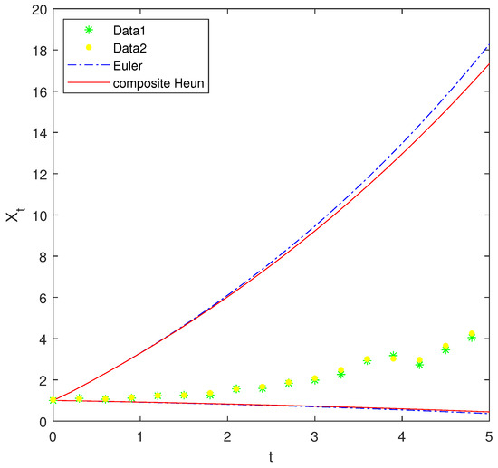 Table 2 demonstrates that the method of moments via the composite Heun scheme performs better than the Euler scheme. According to Figure 1, the total observations of lie in the region between the -path and the -path, which means that both estimation methods are acceptable.