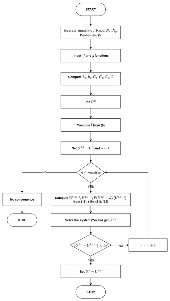 In order to approximate the solution to the nonlocal and nonlinear reaction–diffusion problem (1), we propose a semi-implicit numerical scheme based on finite differences and the iterative Newton method. To do so, we shall use a forward finite difference formula for the time derivative of u with an order of accuracy of , where is the difference between two successive time points where the solution is approximated. The numerical method is a semi-implicit and not fully implicit one because not all of the terms can be evaluated at the current moment in time. Thus, for the integral terms in Equation (1), the evaluations from the time point before the current one will be used.