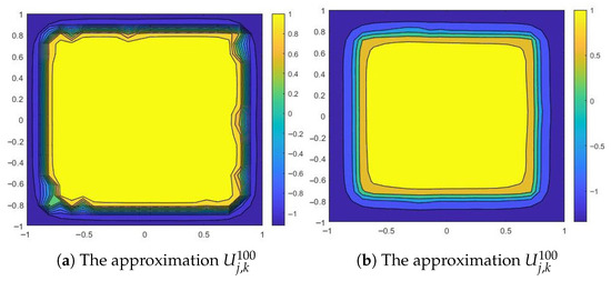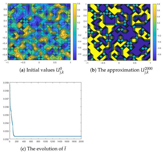 All these results are consistent with those in [2,7,11], since it has been proved that, for a large enough diffusion coefficient, the solutions to particular forms of problem (1) do coarsen to either or . The results of this experiment allow us to conclude that the approximate solution obtained by applying the proposed numerical method is sufficiently accurate.
