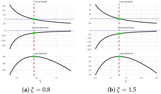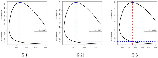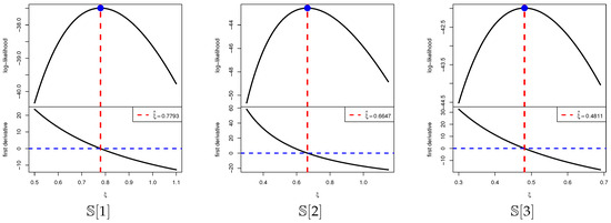 It is also important to investigate the existence and uniqueness of the MLE . Owing to the complicated structure of the score equation in (8), establishing these properties analytically is not straightforward. To overcome this difficulty, we examine them numerically by generating a T2I-APC sample from the ZL distribution with two different choices of , namely , under the setup , , , and . The resulting MLEs of are 0.7458 and 1.2721 for the two cases, respectively. Figure 1 illustrates the log-JLF together with its first and second derivatives. The plot indicates that the vertical line at the MLE intersects the log-JLF at its maximum and the score function at zero. These graphical observations confirm that the MLE of exists and is unique.