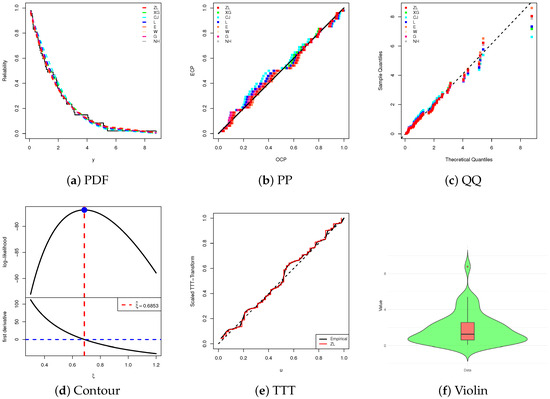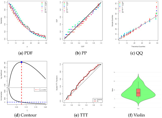 To complement the numerical results, Figure 3 presents several graphical diagnostics, including: (i) estimated and fitted RF curves, (ii) probability–probability (PP) plots, (iii) quantile–quantile (QQ) plots, (iv) scaled total time on test (TTT) transform curves, (v) the log-likelihood curve relative to the fitted normal equation, and (vi) a boxplot-overlaid violin plot. From the complete leukemia dataset, Figure 3a–c clearly demonstrate that the ZL model offers an adequate fit, consistent with the goodness-of-fit measures. The TTT plot in Figure 3d suggests an increasing HRF, while Figure 3e confirms both the existence and uniqueness of the MLE , making it a reasonable starting value for further estimation. Finally, the distributional features depicted in Figure 3f indicates that the leukemia data distribution is approximately symmetric, with reduced variability and concentration around the median, although a slight right-skewness remains evident.