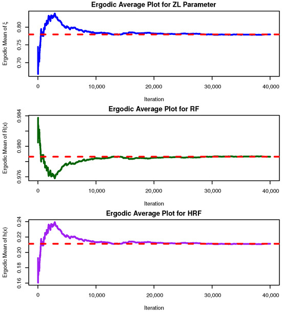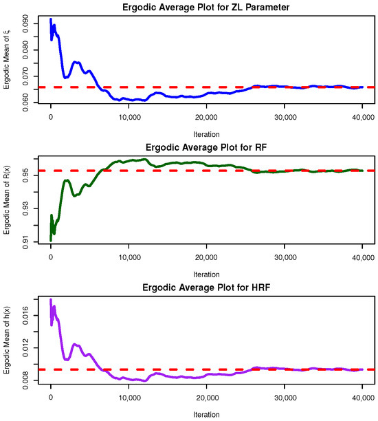 Convergence of the MCMC samples for , , and is assessed through trace plots and posterior density plots shown in Figure 5. The posterior mean and the 95% BCI estimates are highlighted by red solid and dashed lines, respectively. As illustrated in Figure 5, the Markov chains exhibit satisfactory mixing and stabilization for all parameters. The posterior of appears nearly symmetric, whereas and display negative and positive skewness, respectively. Using the 40,000 post–burn-in samples, several posterior summaries were calculated for , , and , including the mean, mode, quartiles , standard deviation (Std.D), and skewness (Sk.); see Table 12. These summaries align well with the results reported in Table 11 and the graphical evidence in Figure 5. To further evaluate the convergence behavior of the MCMC chains, ergodic average plots (i.e., cumulative means) were generated for the posterior samples of the parameters , , and based on [1] (as an example); see Figure 6. The trajectories of these running averages flatten after the initial 30,000 burn-in iterations, confirming that the chains have reached stationarity. This visual stabilization, together with the absence of strong autocorrelation patterns, supports the ergodicity of the generated Markov chains and validates the reliability of the Bayesian estimates fitted from the leukemia dataset.