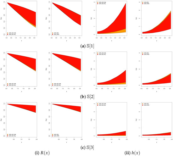 For deriving the ACIs of the RF and HRF , one must first obtain suitable approximations for the variances of their estimators, and . An effective approach is the delta method, which provides variance estimates denoted by and . As outlined in Greene [10], the delta method ensures that can be treated as approximately normal with mean and variance , and likewise, is approximately normal with mean and variance . Subsequently, the quantities of and are given by: