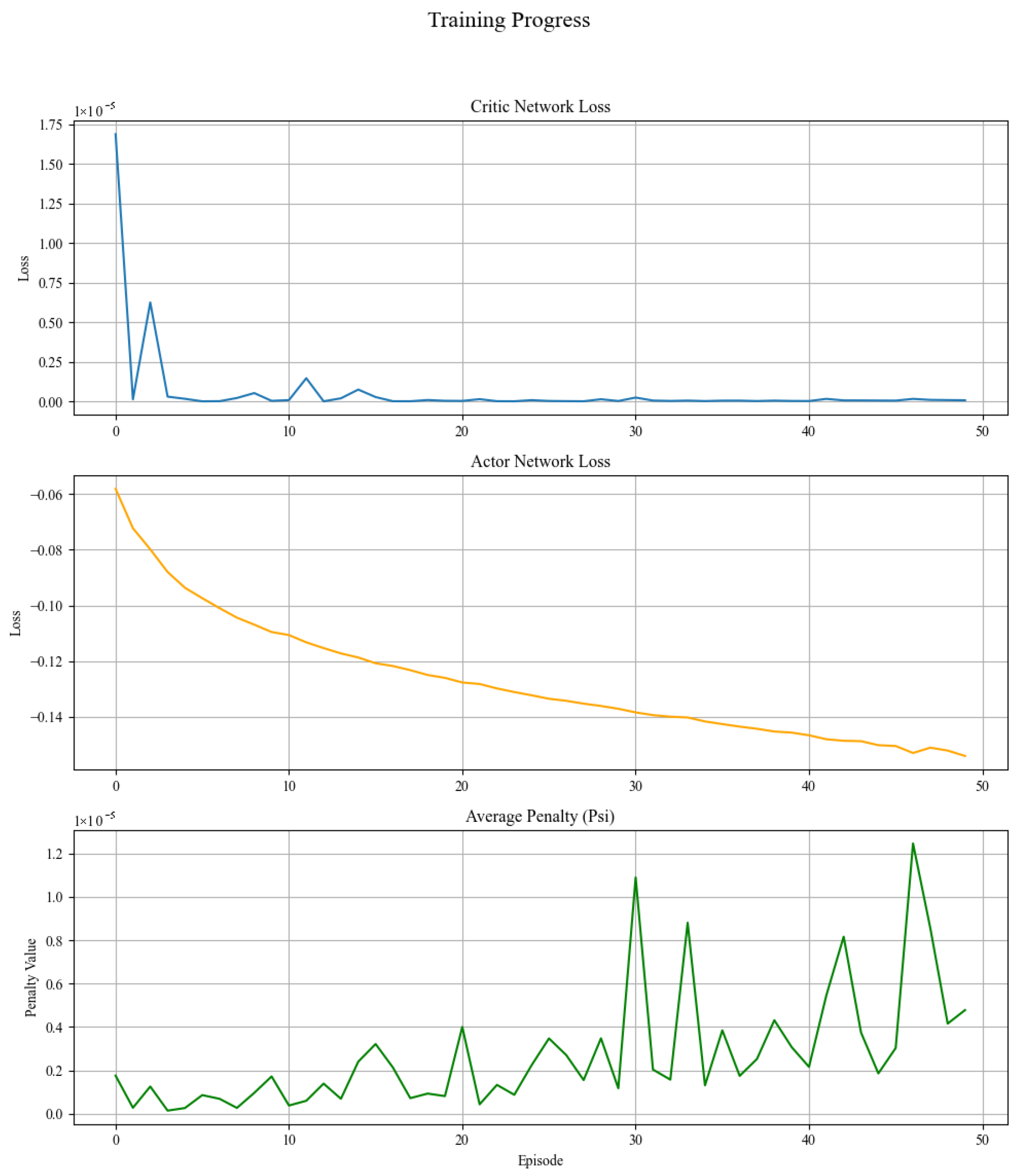 The training diagnostics are summarised in Figure 1. The critic loss decreases monotonically from to within 50 episodes, indicating stable convergence of the value network. The actor loss quickly drops to approximately and remains in a narrow band; the negative value is attributable to the entropy regulariser, confirming simultaneous improvement of expected returns and preservation of exploration. The average penalty term Ψ falls from to about and flattens thereafter, demonstrating that the KL divergence between the alternative and reference measures is effectively controlled.