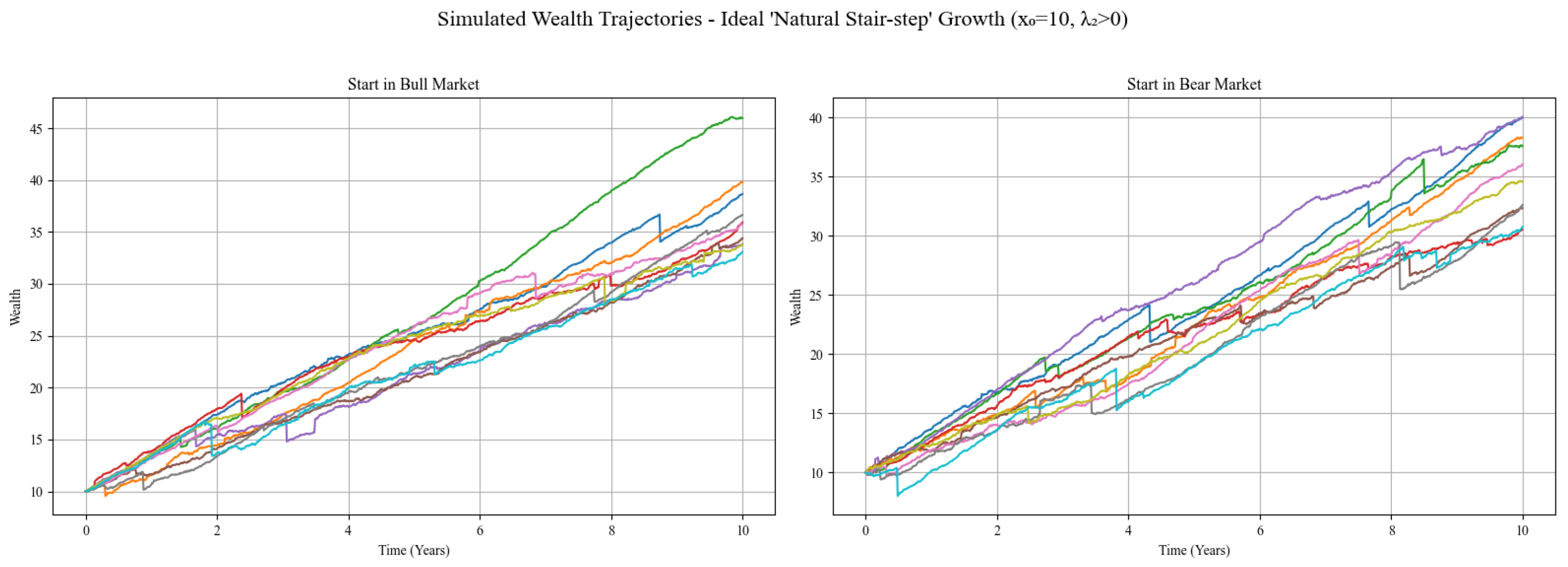 The insurer’s surplus process under the corresponding optimal policy is depicted in Figure 3. Under the robust control framework, the insurer’s surplus trajectory exhibits a “staircase-like” steady growth: the initial market regime has only a limited impact on the path. Regardless of whether the departure point is a bull or bear market, the surplus rapidly converges to a common upward channel within a short period, with the maximum drawdown tightly restricted to approximately five units and the volatility diminishing over time. Throughout the entire planning horizon, the curve moves smoothly upward without severe reversals, demonstrating a strong immunity to model uncertainty and common shocks. Ultimately, the two trajectories almost overlap and stabilize in the 35–40 range, fully embodying the conservative optimization philosophy of “promoting growth through stability” and providing the insurer with a sustainable and resilient capital evolution path.