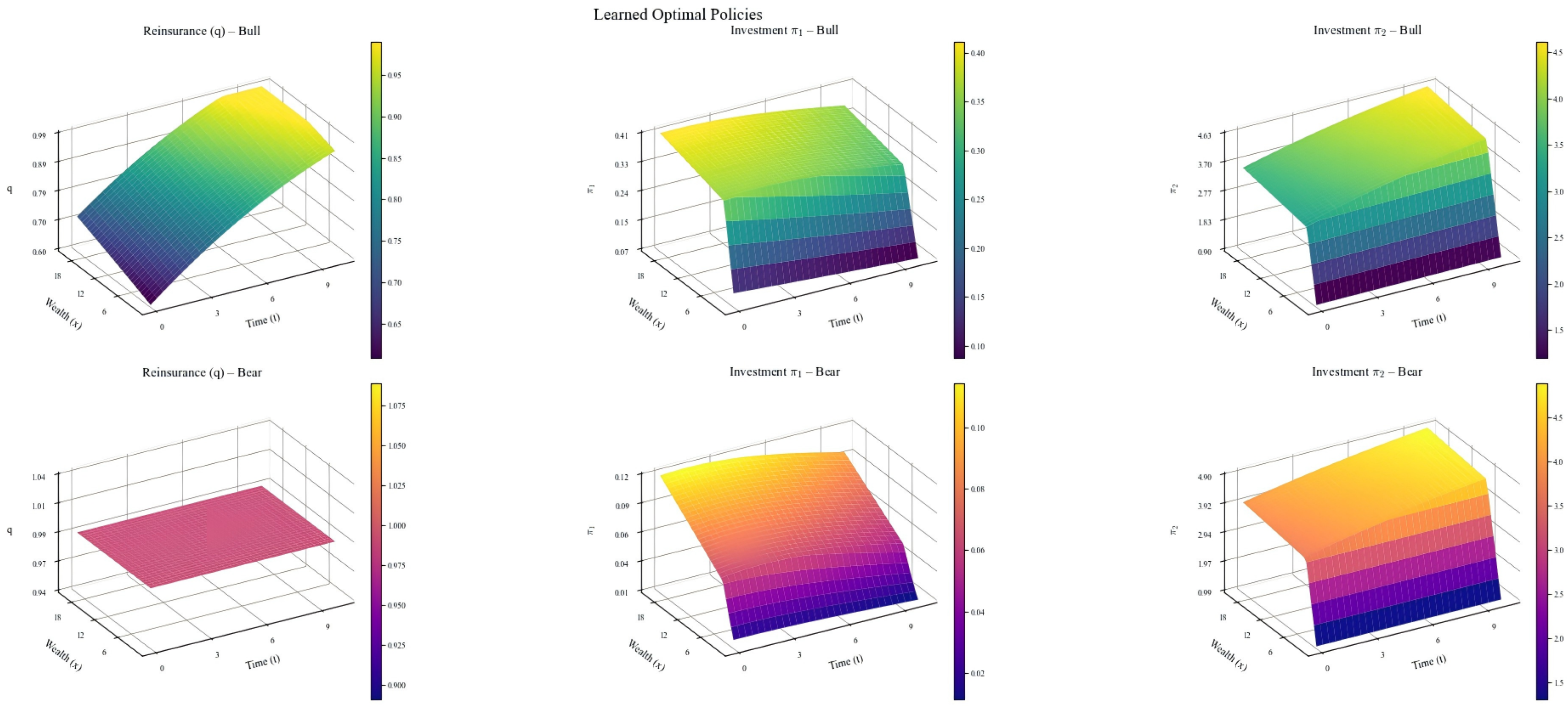 The training curves guarantee numerical reliability, while the policy trajectories illustrate that the algorithm successfully adapts retention and asset allocations to regime-dependent risk profiles. Together, they substantiate the effectiveness of the proposed actor–critic method in solving the high-dimensional HJB system with model uncertainty and jump risk.