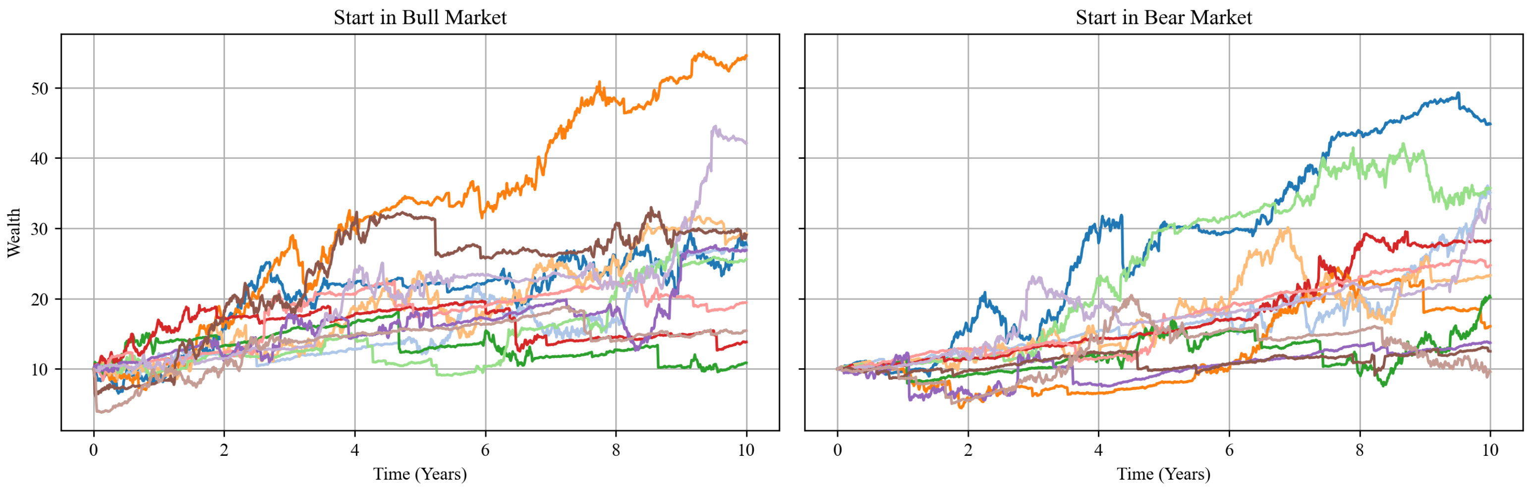 This section presents numerical simulations based on our theoretical framework. The planning horizon is set to years with a time step of year. We consider a regime-switching Markov chain with state space and generator matrix