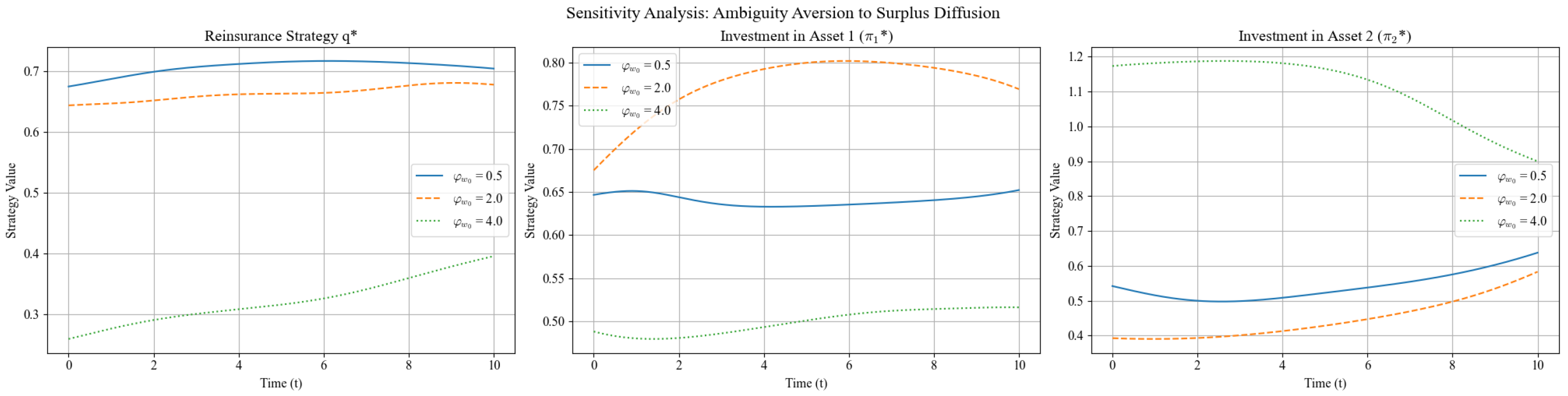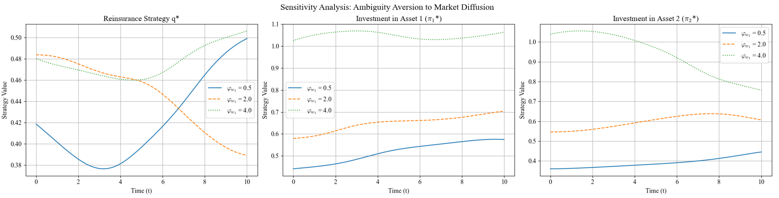 The three panels in Figure 8 illustrate how the optimal strategy varies with the ambiguity-aversion parameter toward market diffusion . As ambiguity aversion toward market diffusion rises, the optimal reinsurance ratio only edges up from about to , indicating a mild response. In contrast, the weight on Asset 1, , falls sharply from to , making it the primary risk-adjustment lever, while the weight on Asset 2, , declines more gently from to . All three trajectories drift slowly downward over time, reflecting Bayesian learning: higher keeps the strategy conservative for longer, but accumulated data gradually relaxes the initial caution. Overall, ambiguity aversion to market diffusion influences the asset side far more than the liability side, with Asset 1 serving as the key dynamic-hedging instrument.
