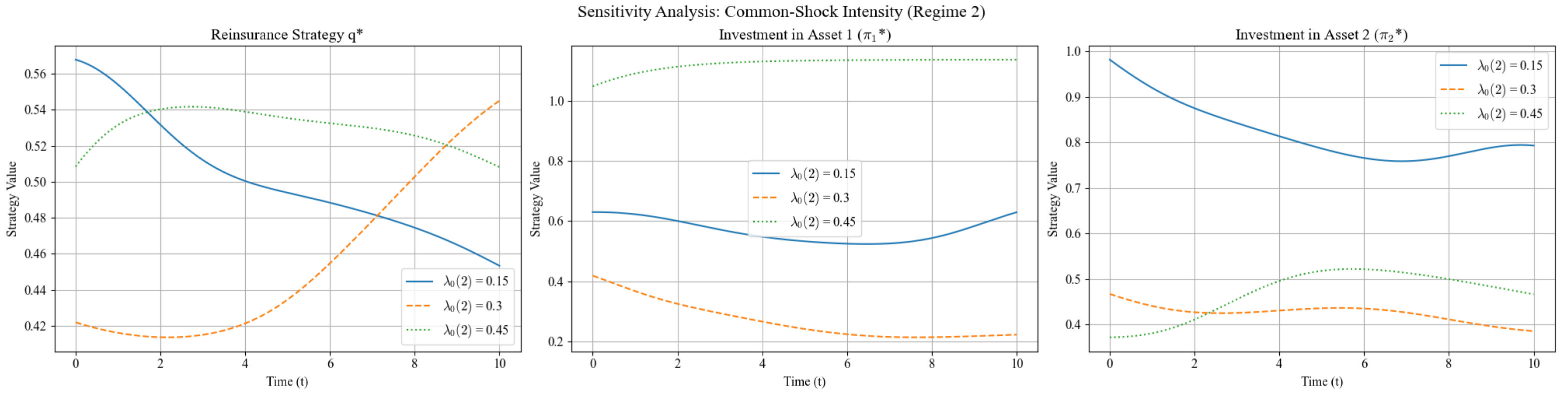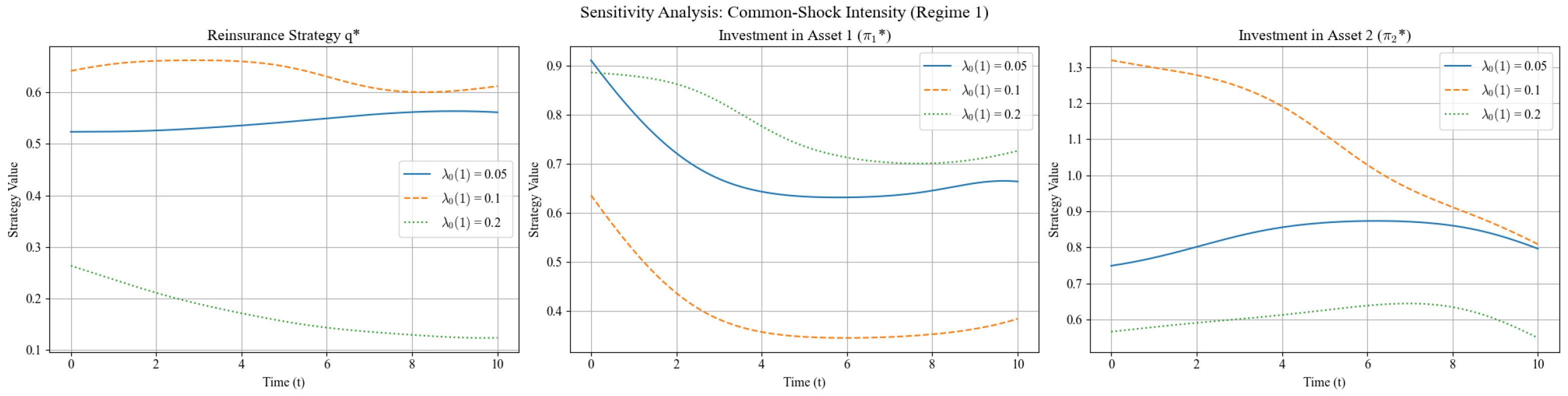 As shown in Figure 10, in the bear-market regime (Regime 2), each increase of in the common-shock intensity raises the optimal reinsurance ratio by roughly 2-C4 percentage points, while the weight on Asset 1, , falls by about ; the weight on Asset 2, , adjusts only marginally. All three trajectories drift slowly downward over time, reflecting Bayesian learning: as more observations accumulate, the tail-probability estimate of a common shock stabilizes, and the initial conservative stance is gradually relaxed. Overall, in the bear-market regime the firm relies more heavily on additional reinsurance than on asset reduction to manage tail risk, with Asset 1 remaining the primary lever for dynamic risk control.